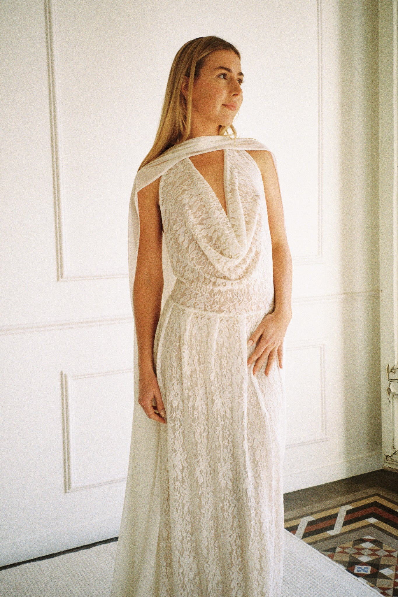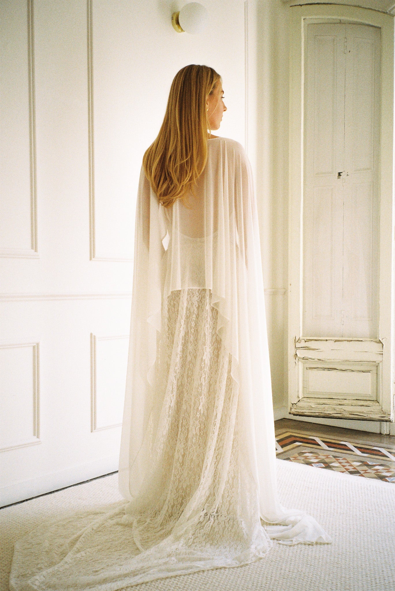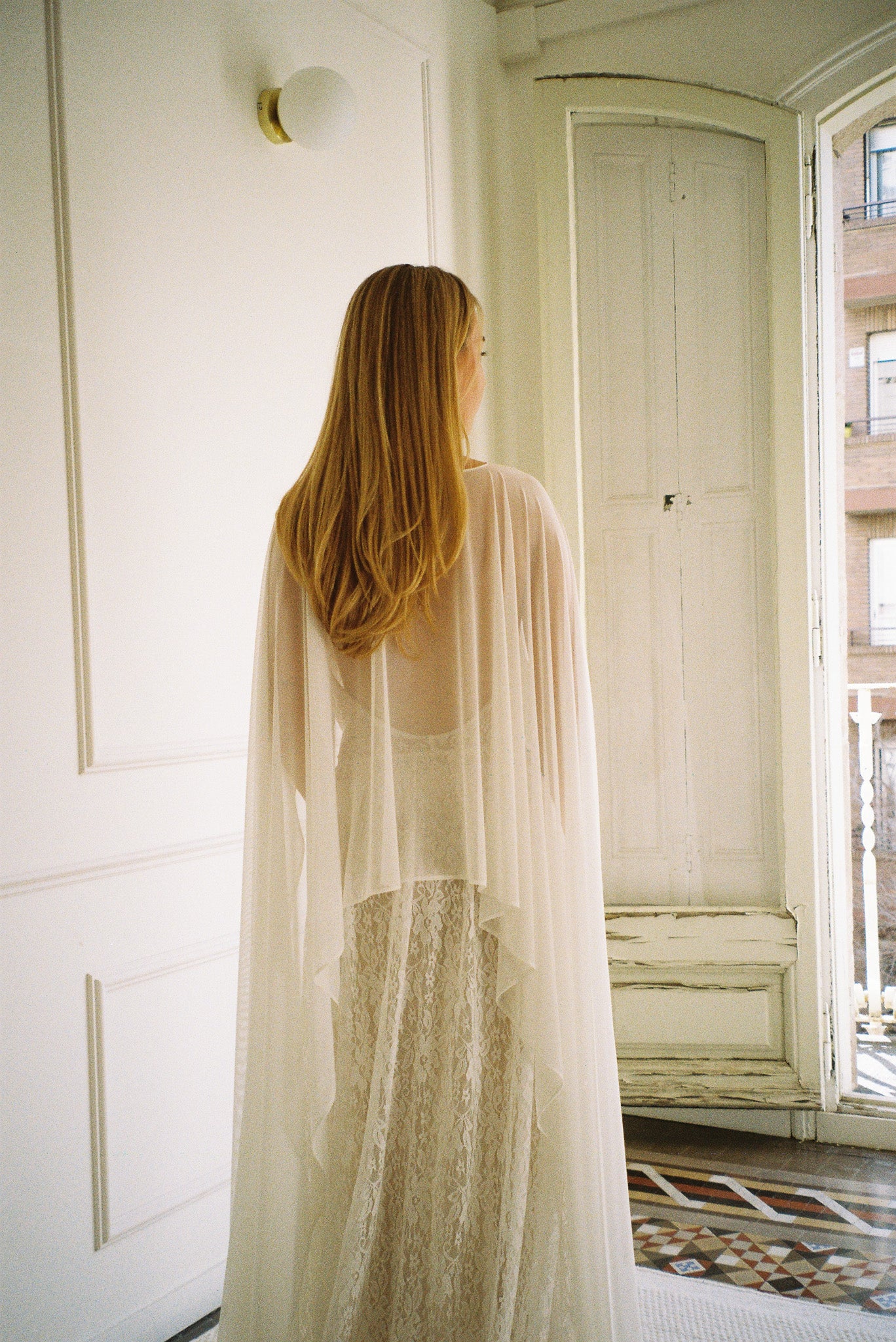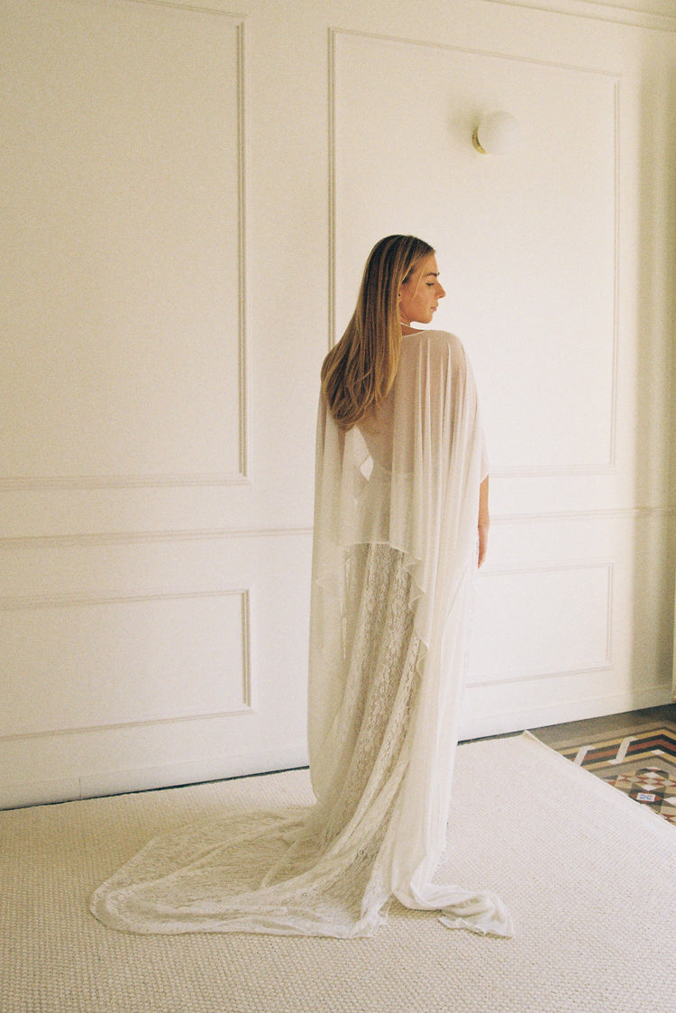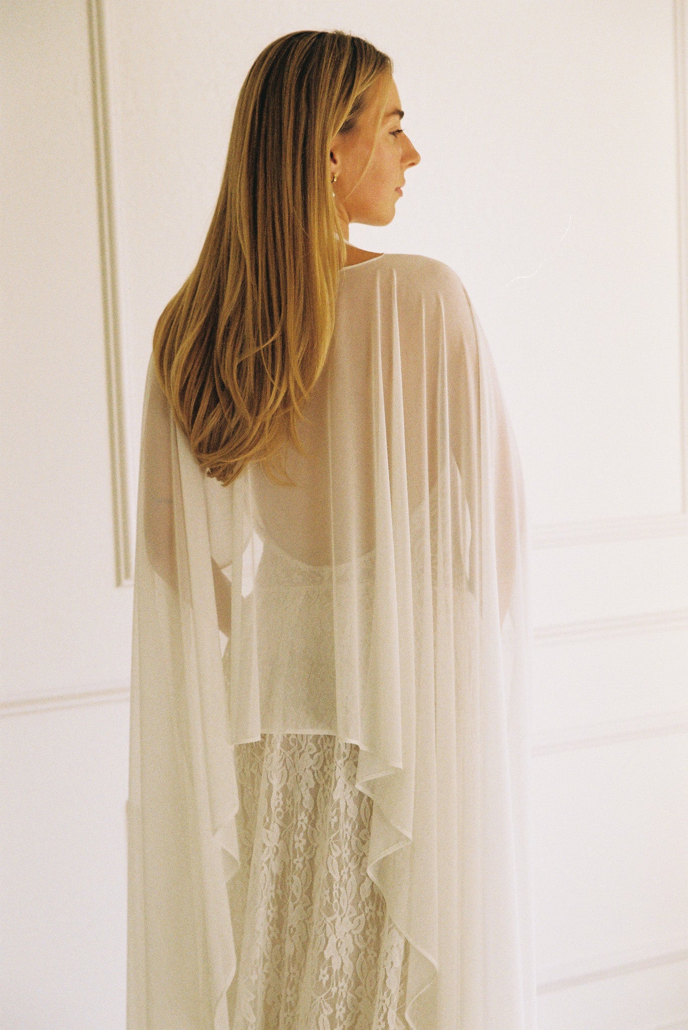 Layer with intention. This mesh cape cascades effortlessly, transforming any look with fluid movement and timeless appeal. The ultimate finishing touch for our signature pieces.