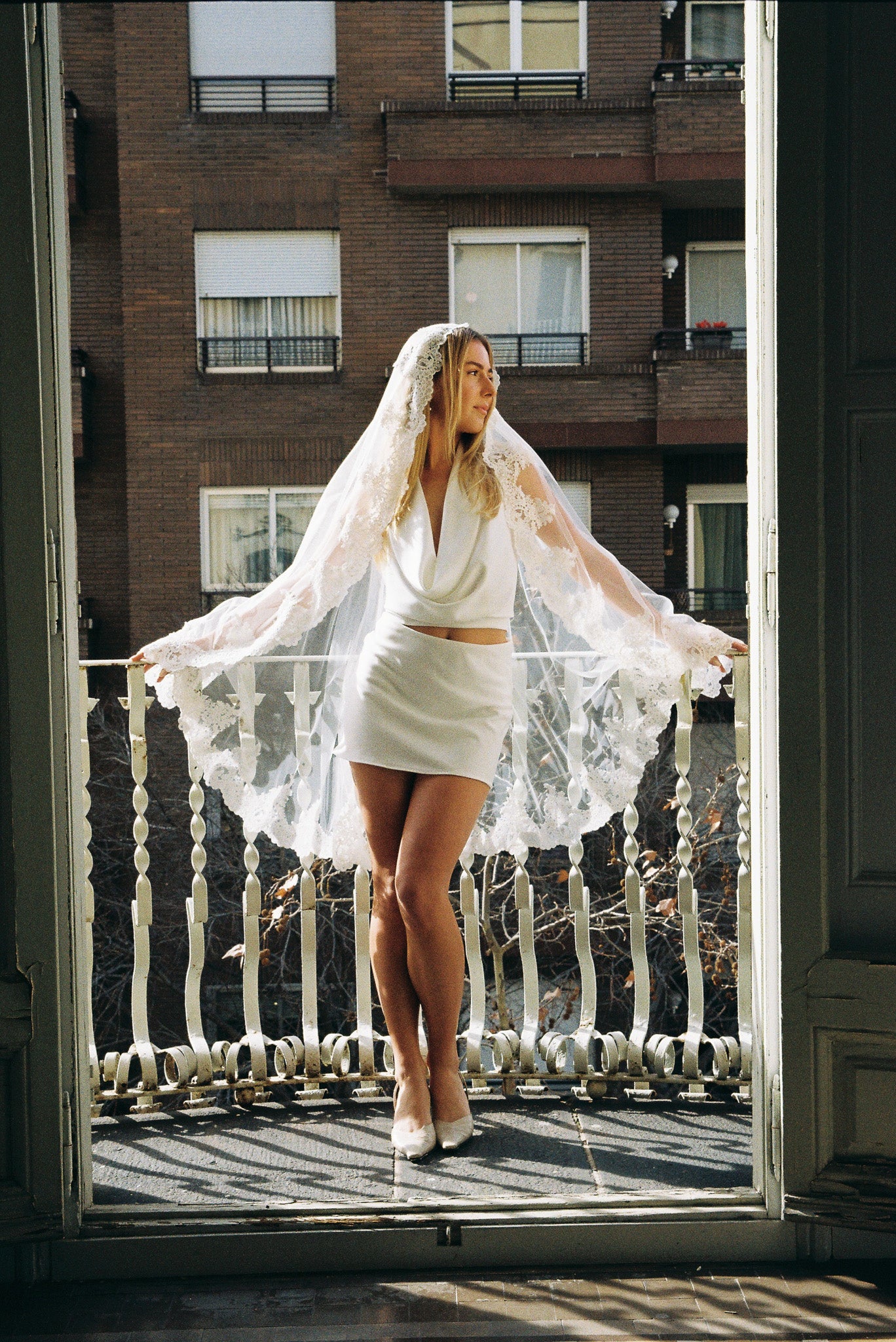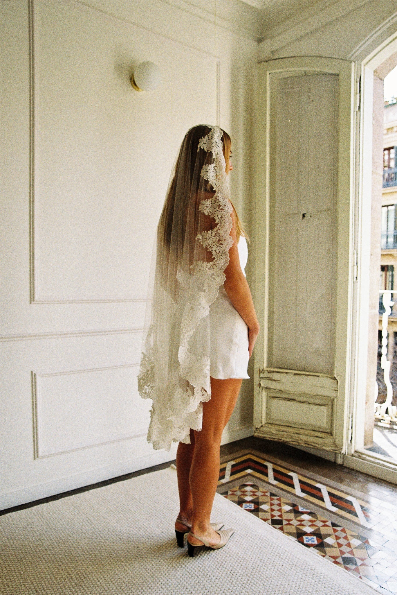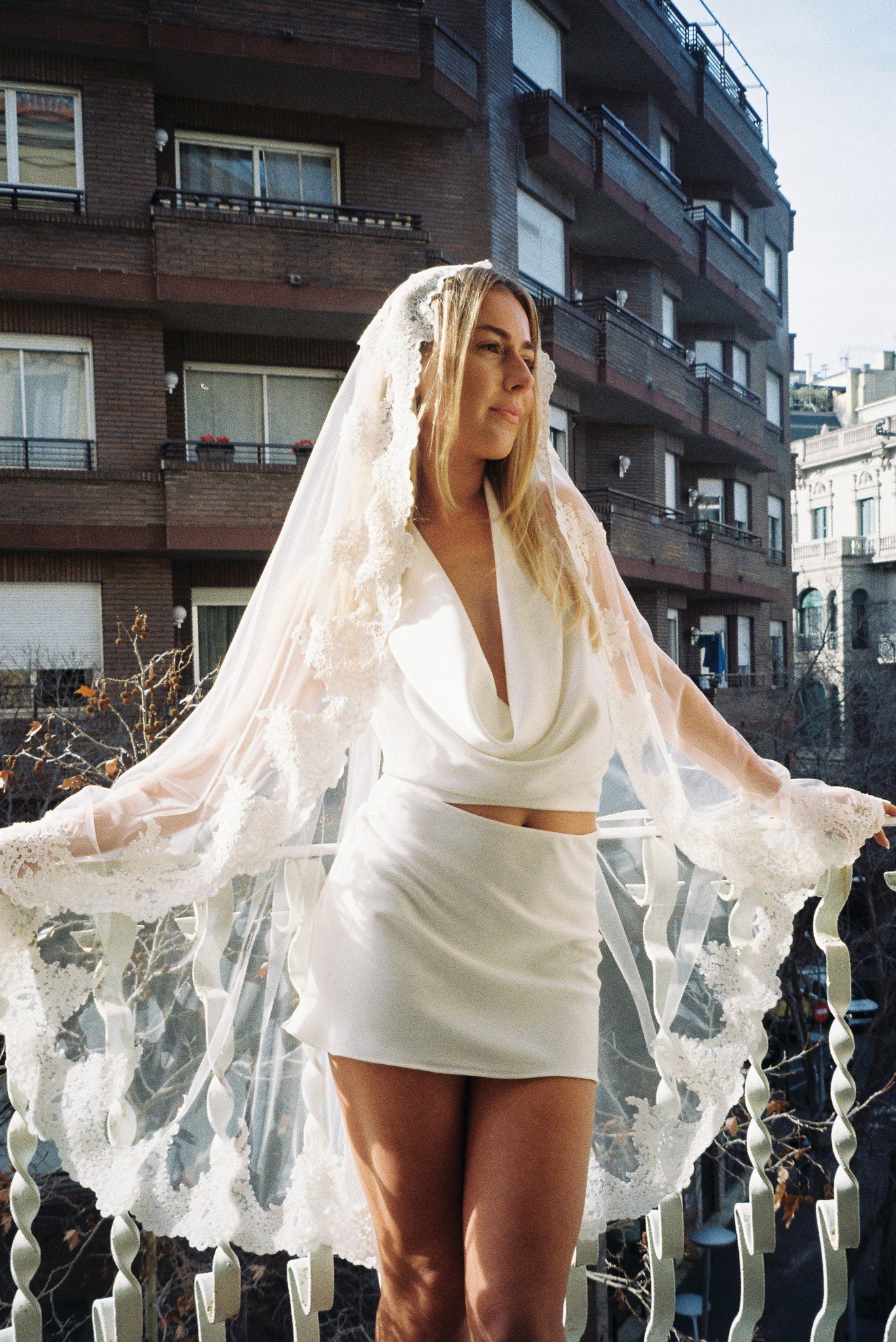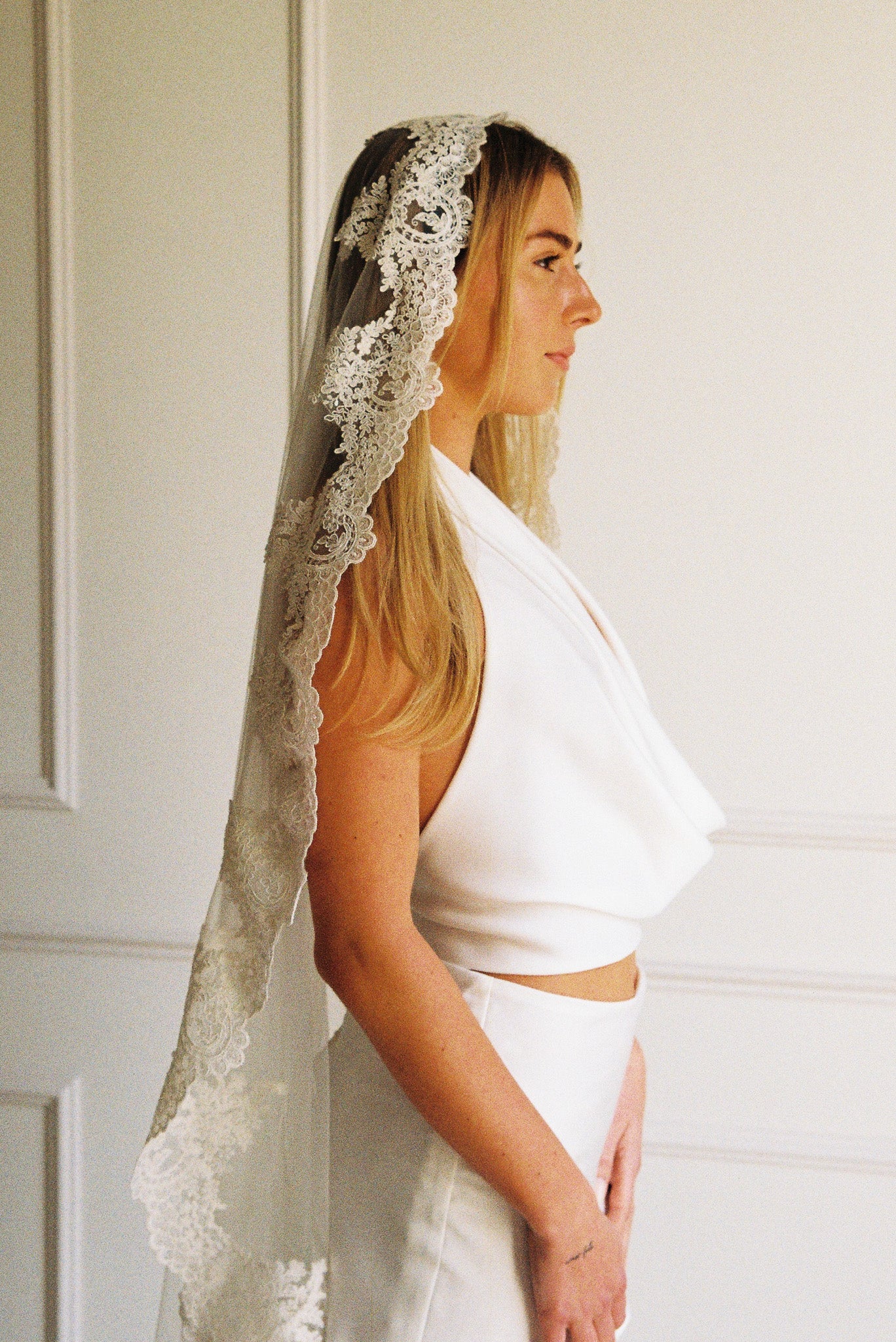 This hand-sewn lace veil adds the perfect finishing touches, romantic, refined, and effortlessly sophisticated. Ideal for brides seeking that extra layer of grace and tradition on their special day.