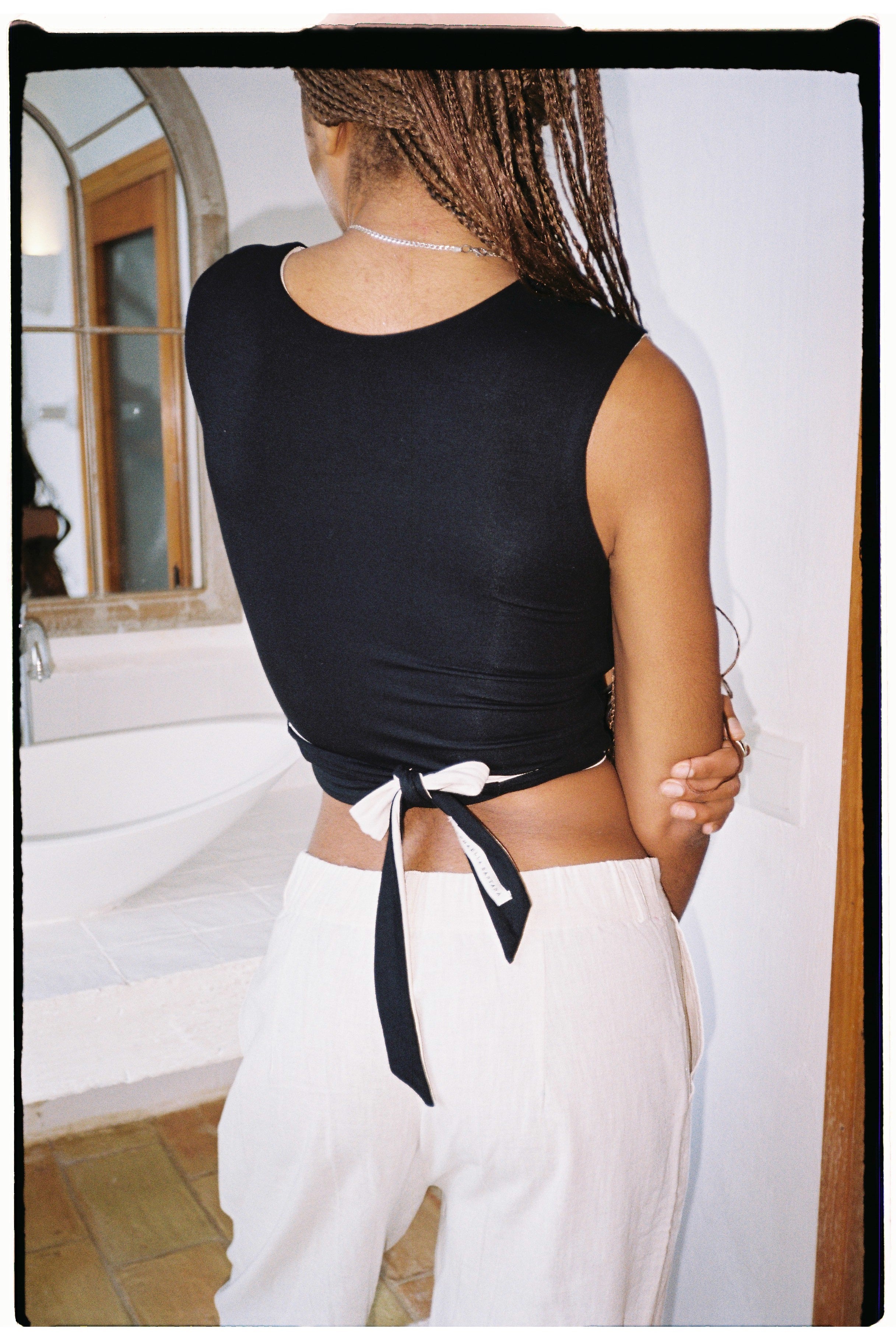 A very versatile and flattering crop top. You can wear it in many different ways. You can choose to wear the V neckline in the front or in the back, as well as the round neck on both sides.