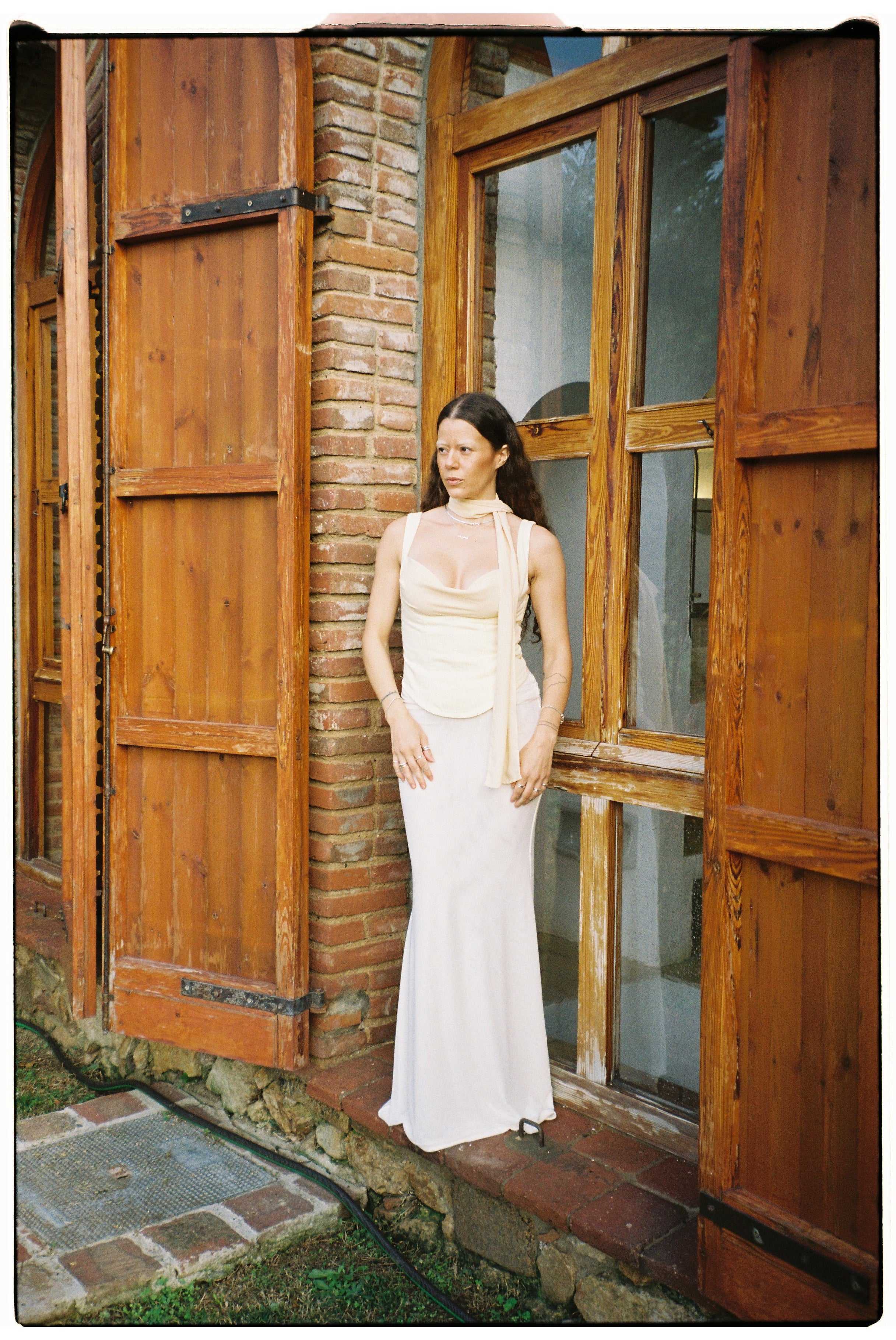 A delicate, feminine design, featuring a beautiful cowl neck cut on the bias. The corset comes with a skinny scarf to make it the ultimate look!