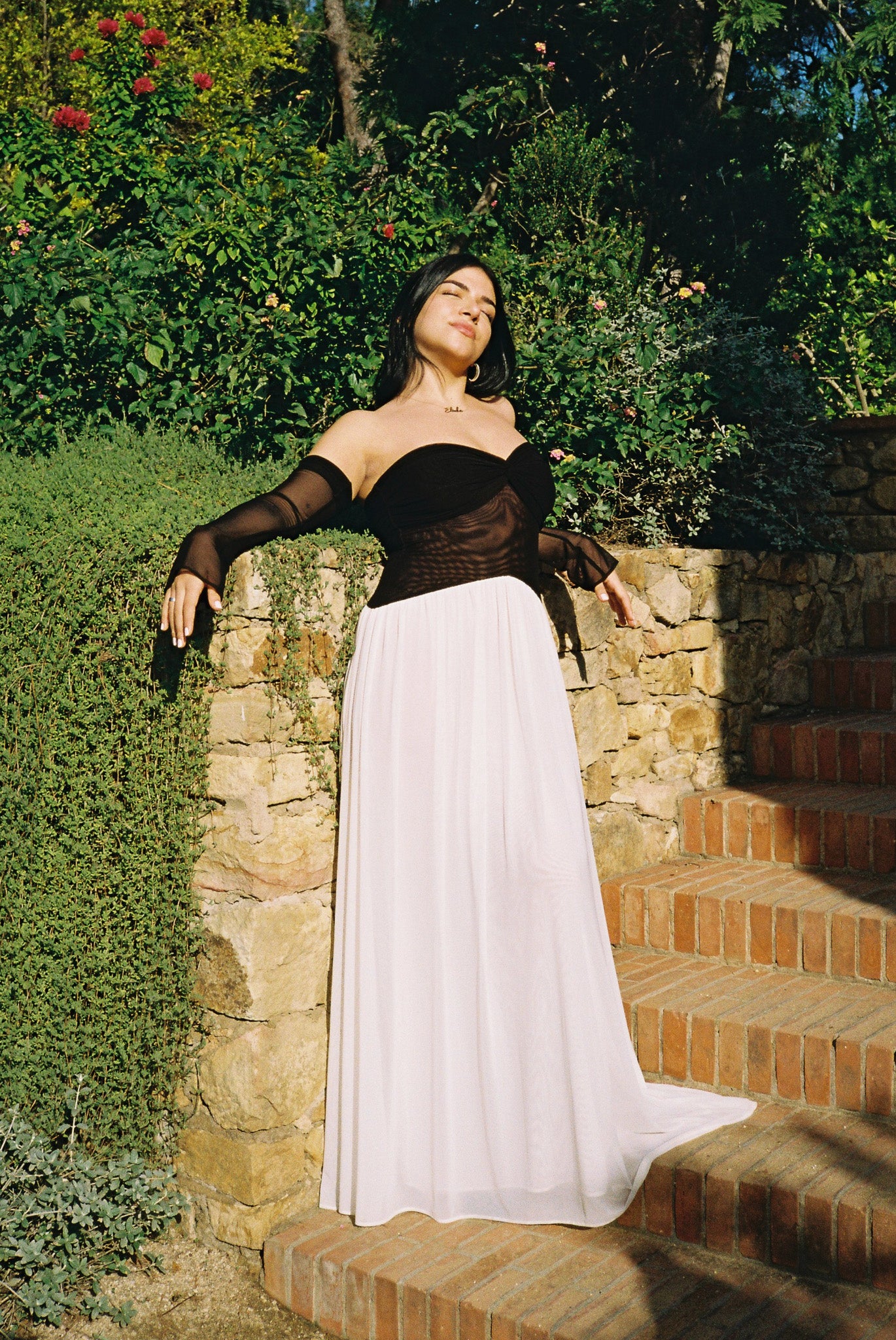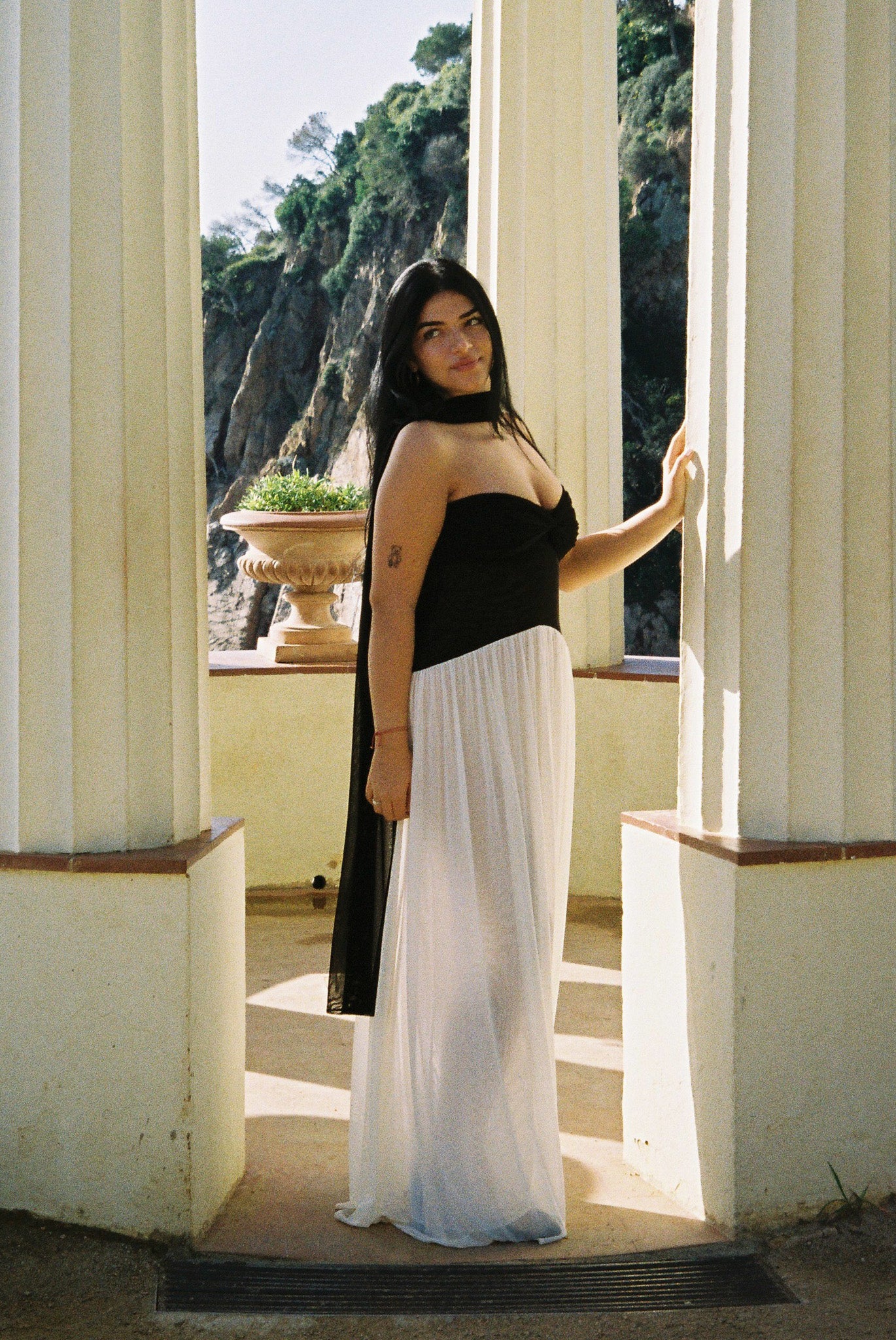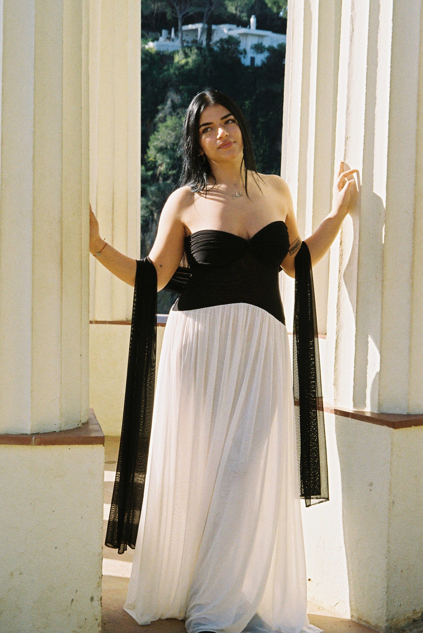 Our iconic design is now available in timeless black and white. This exquisite and unique maxi dress features elegant bust detailing, a reversed waistline, and a beautifully draped skirt that creates a stunning silhouette. Expertly fitted to accentuate your curves, it offers a flattering and sophisticated look for any occasion.