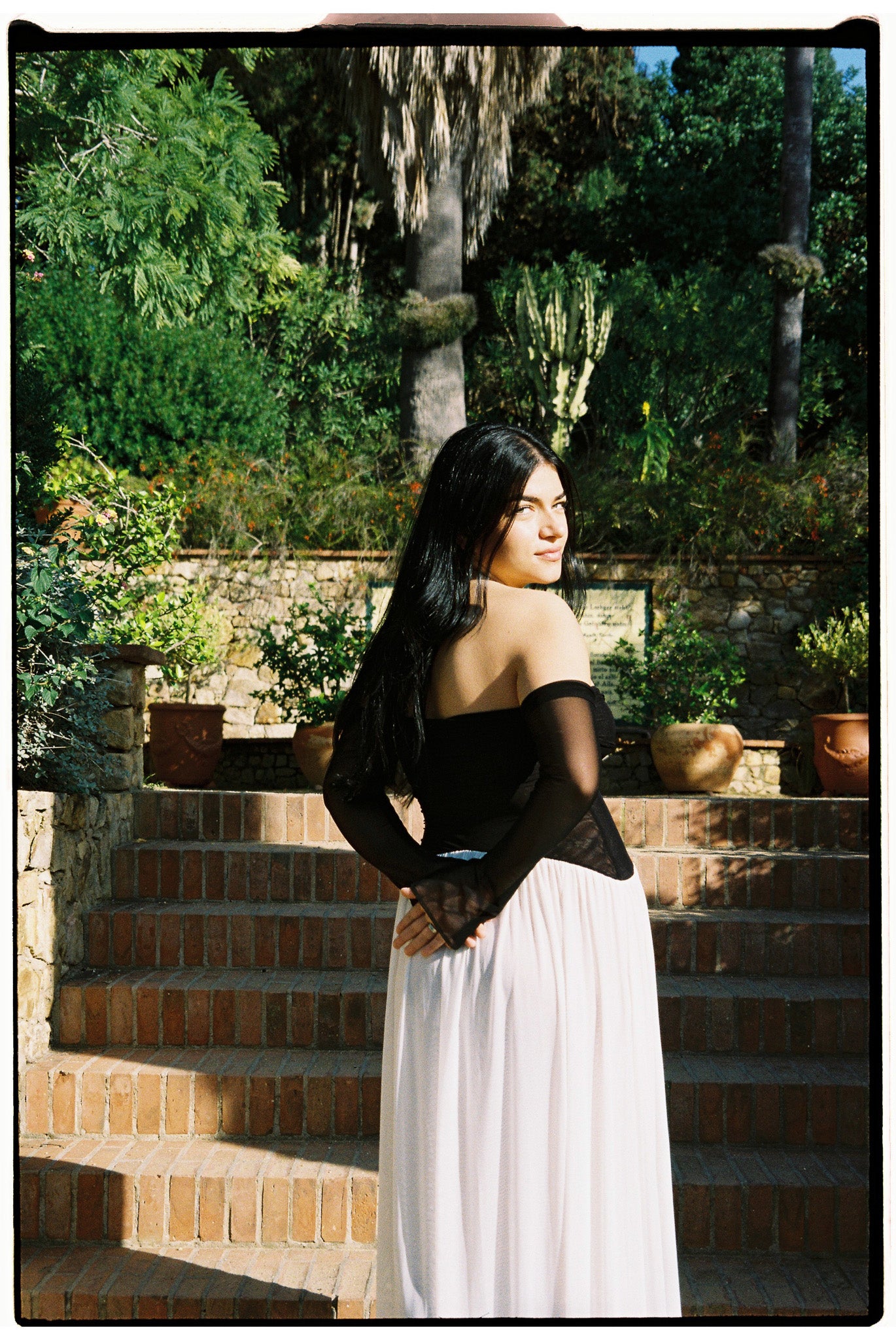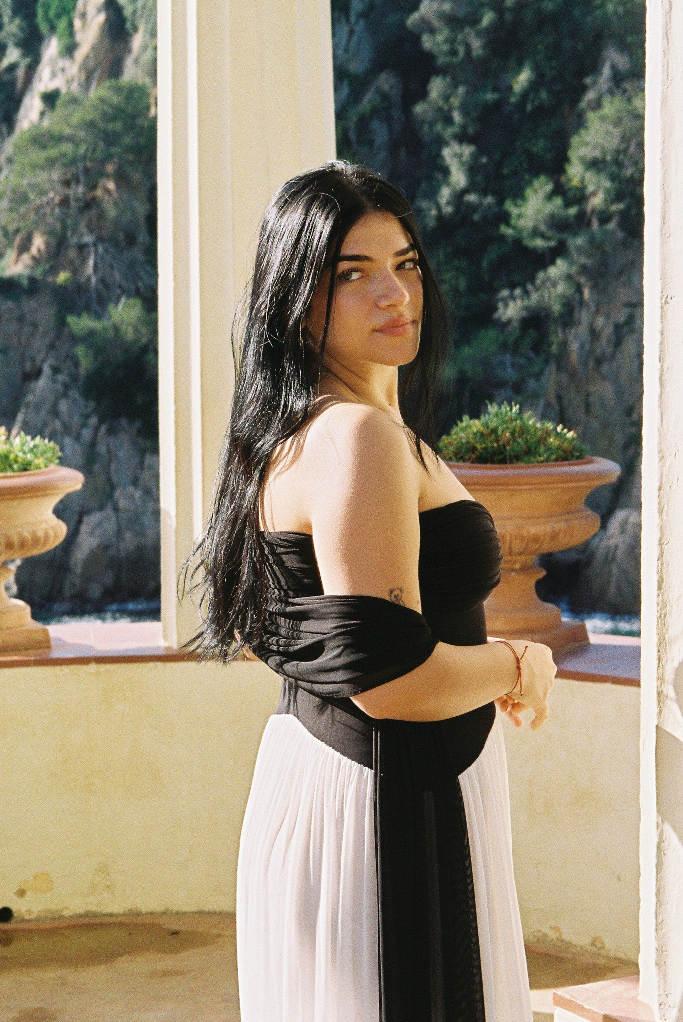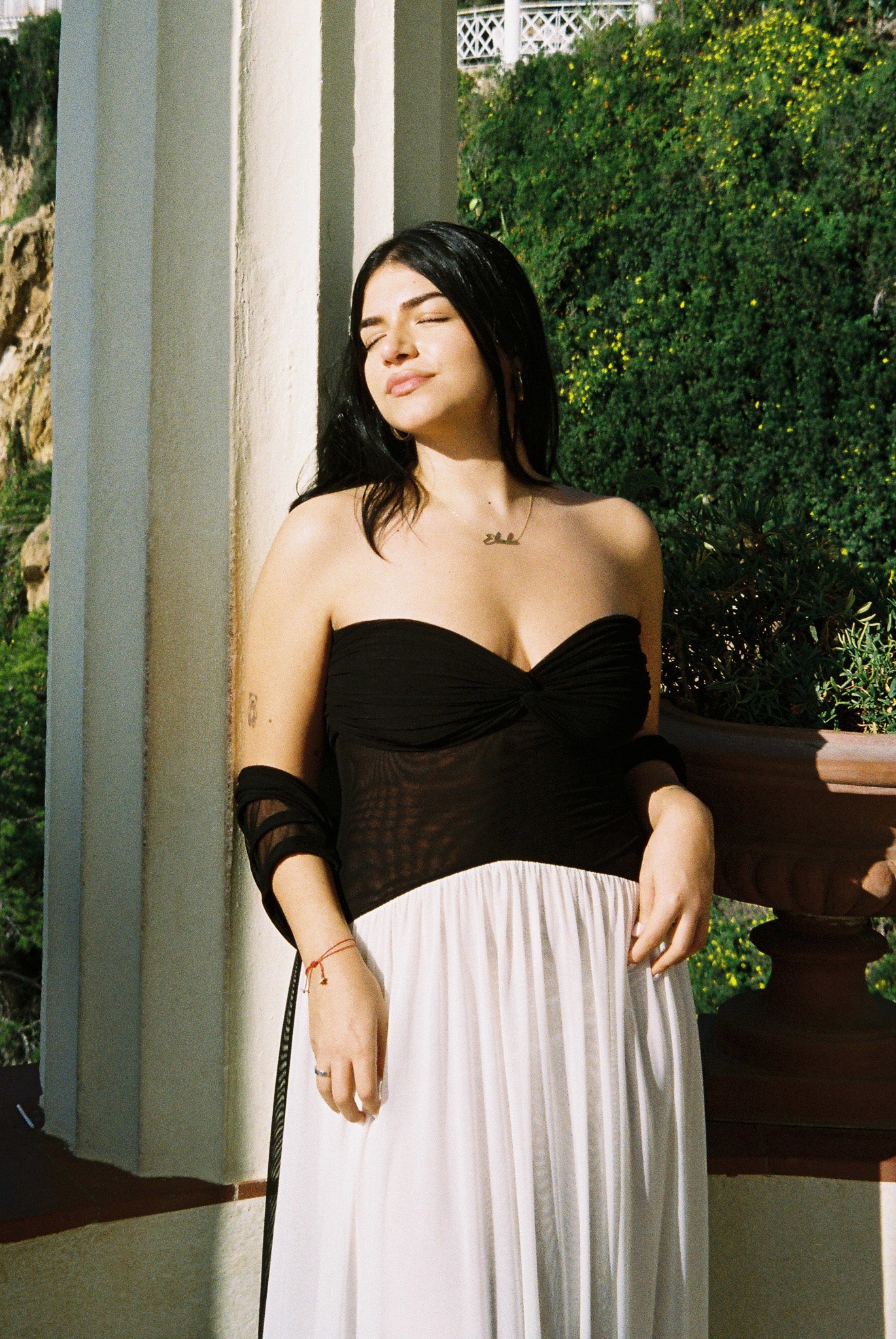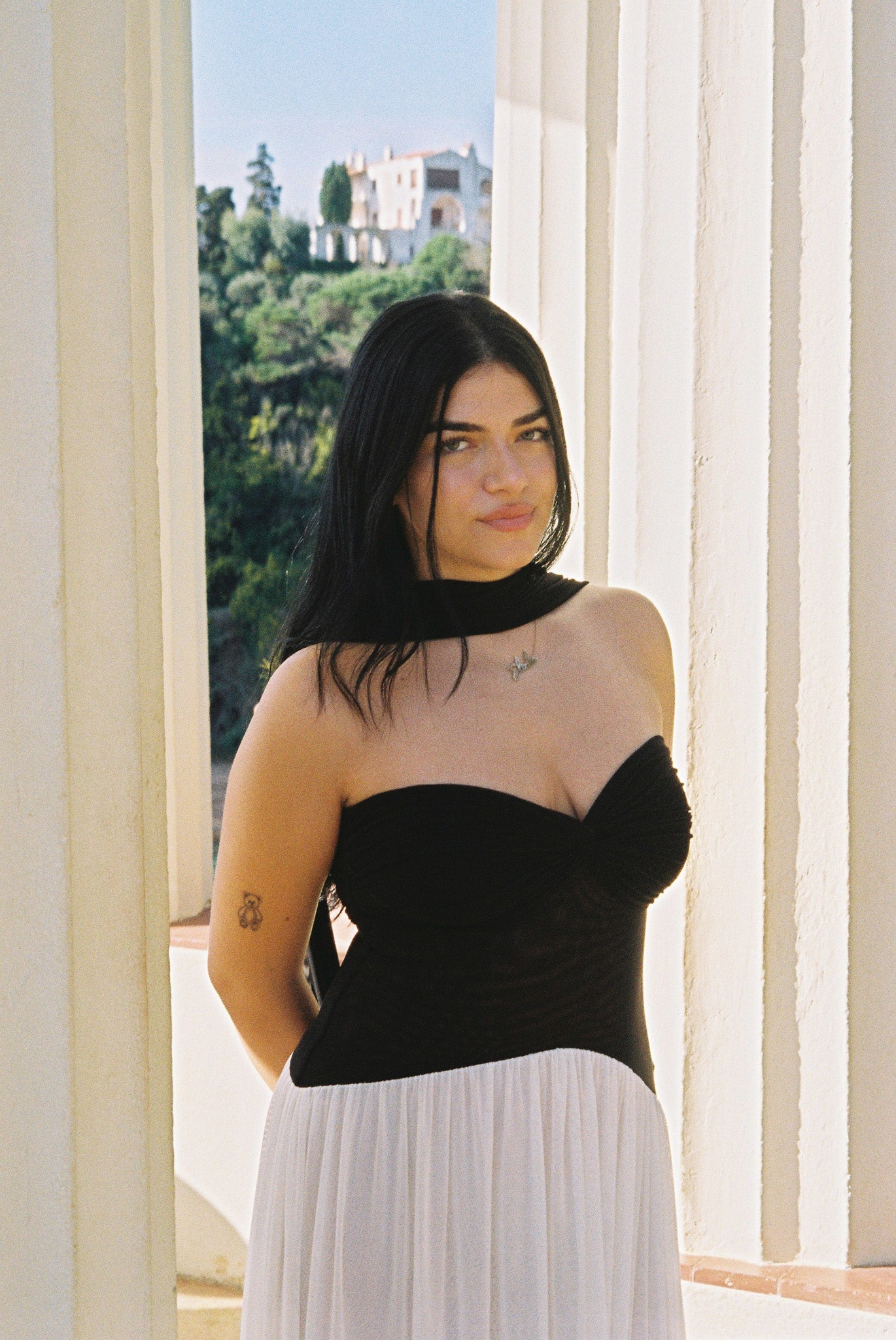 Our iconic design is now available in timeless black and white. This exquisite and unique maxi dress features elegant bust detailing, a reversed waistline, and a beautifully draped skirt that creates a stunning silhouette. Expertly fitted to accentuate your curves, it offers a flattering and sophisticated look for any occasion.