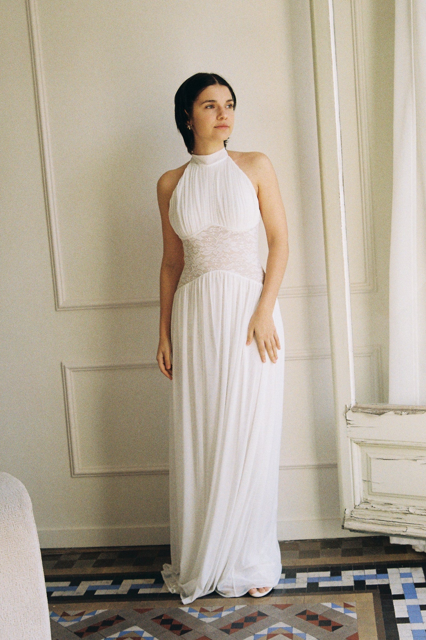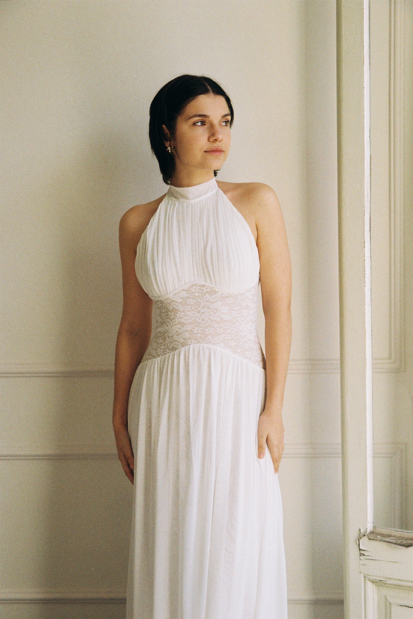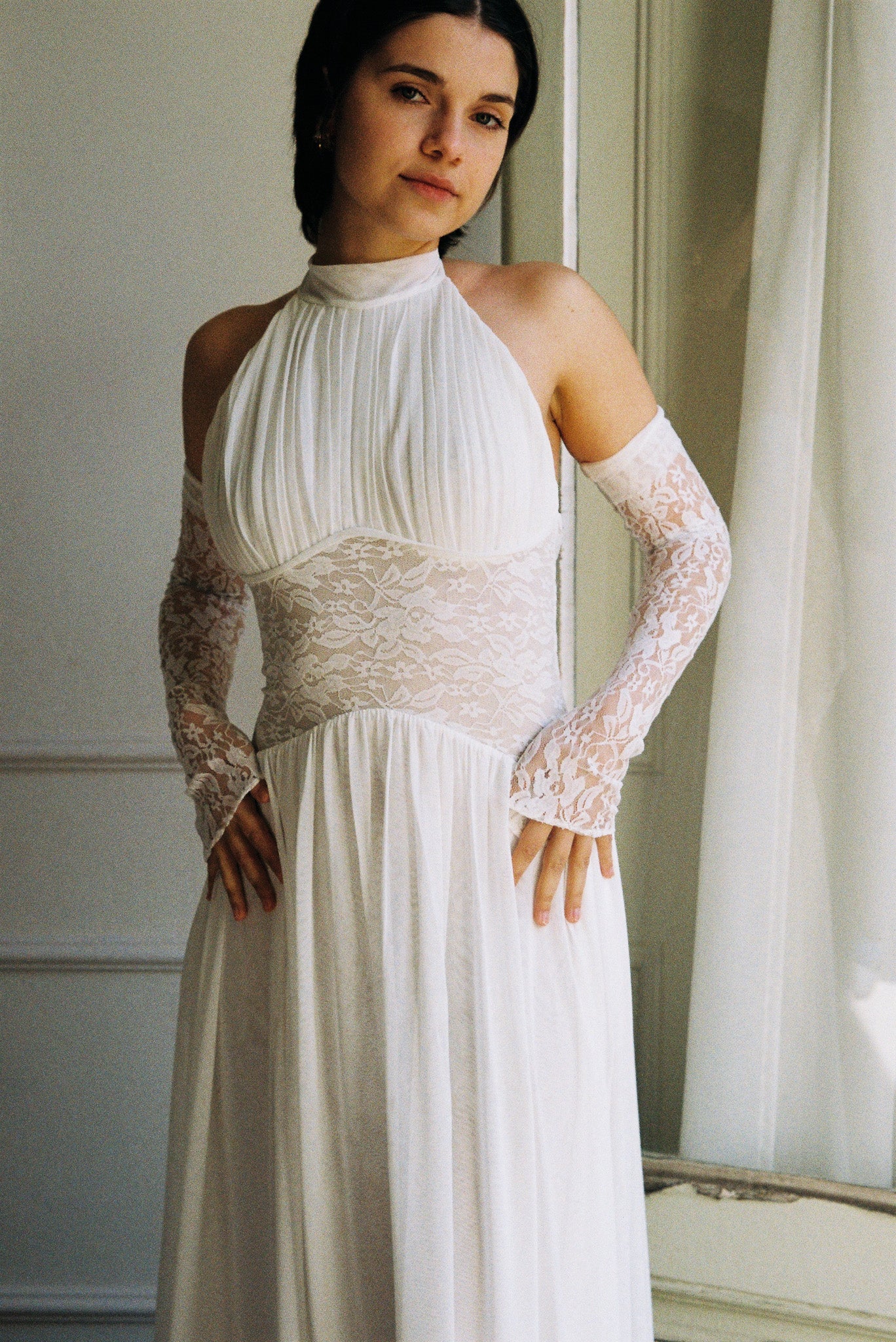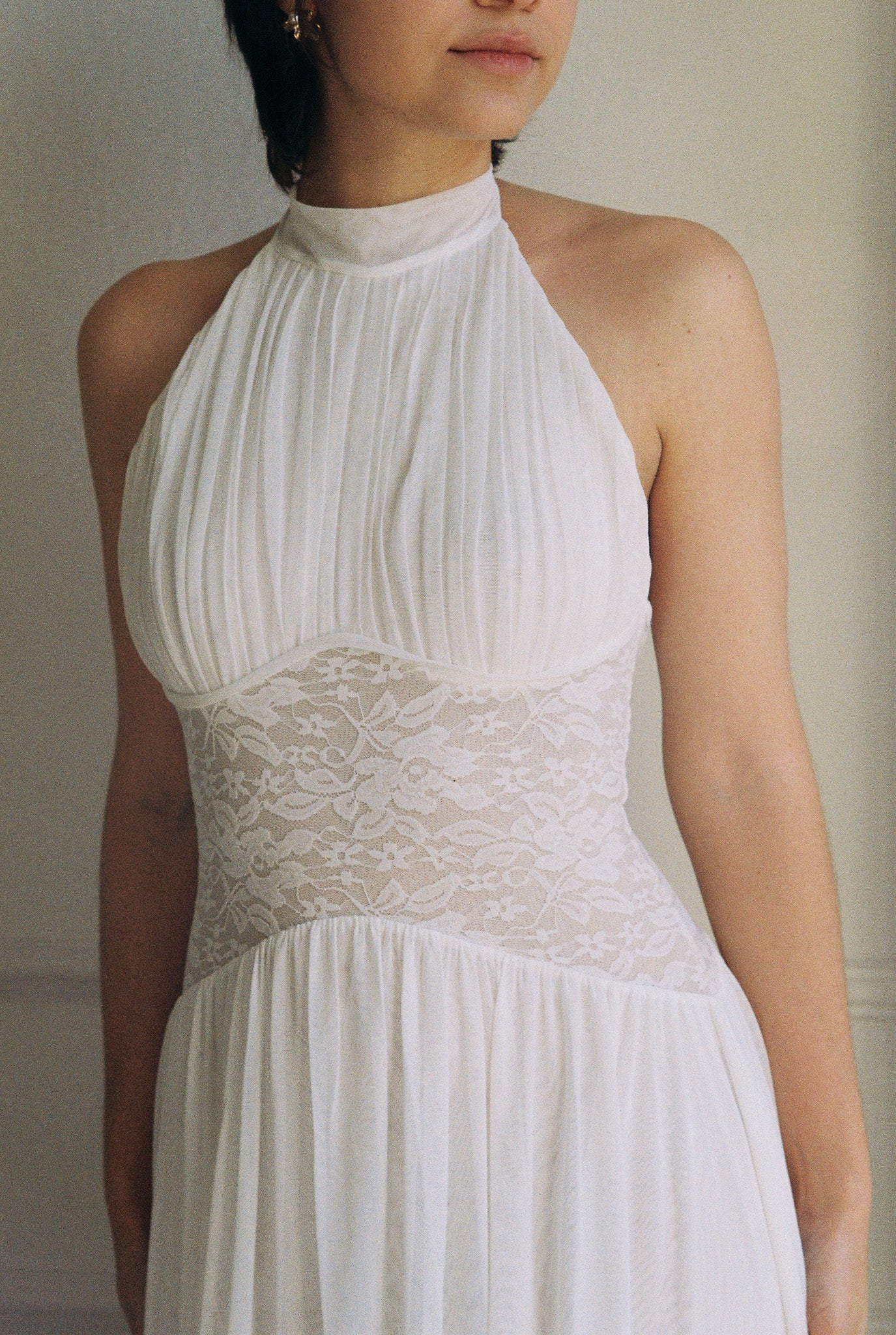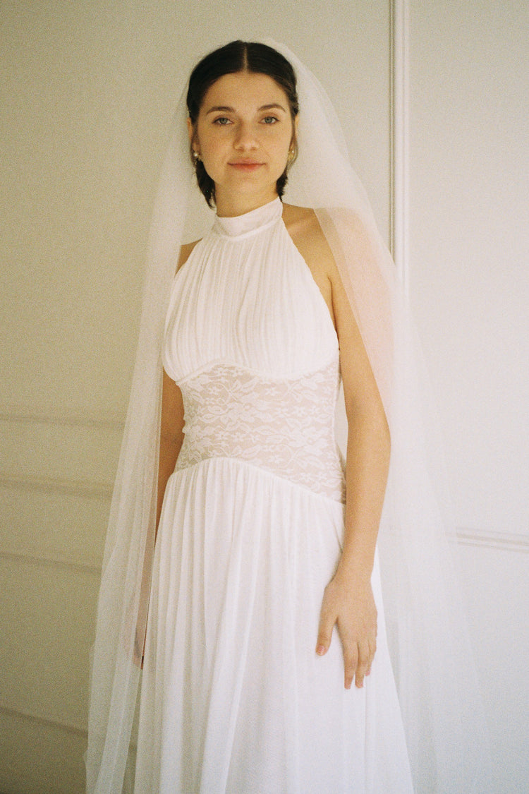The Eloise Dress combines a gracefully draped halter neck with a semi-low back and intricate lace bodice for an effortlessly elegant look. Whether paired with lace gloves for a polished finish or styled as a wedding gown with a veil, this dress delivers timeless sophistication for your special day.
