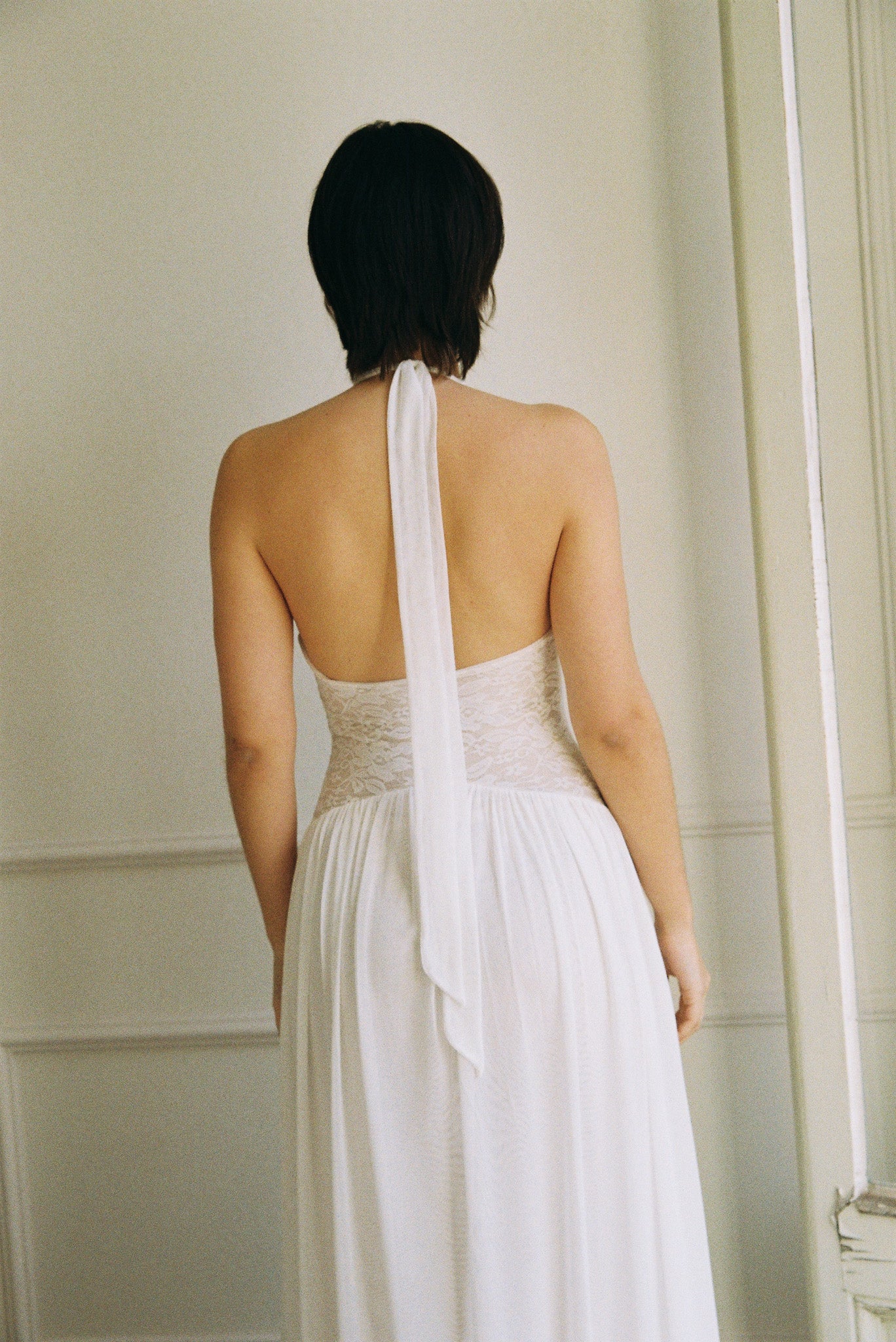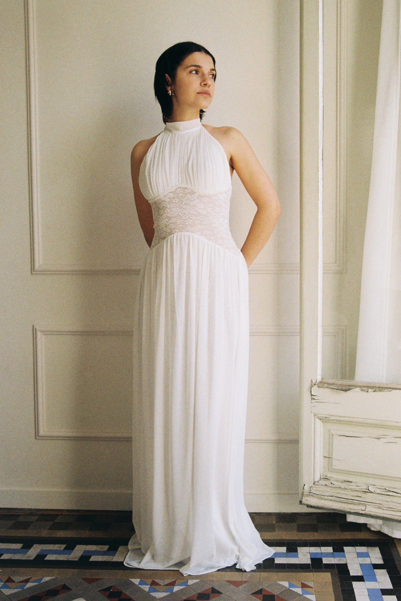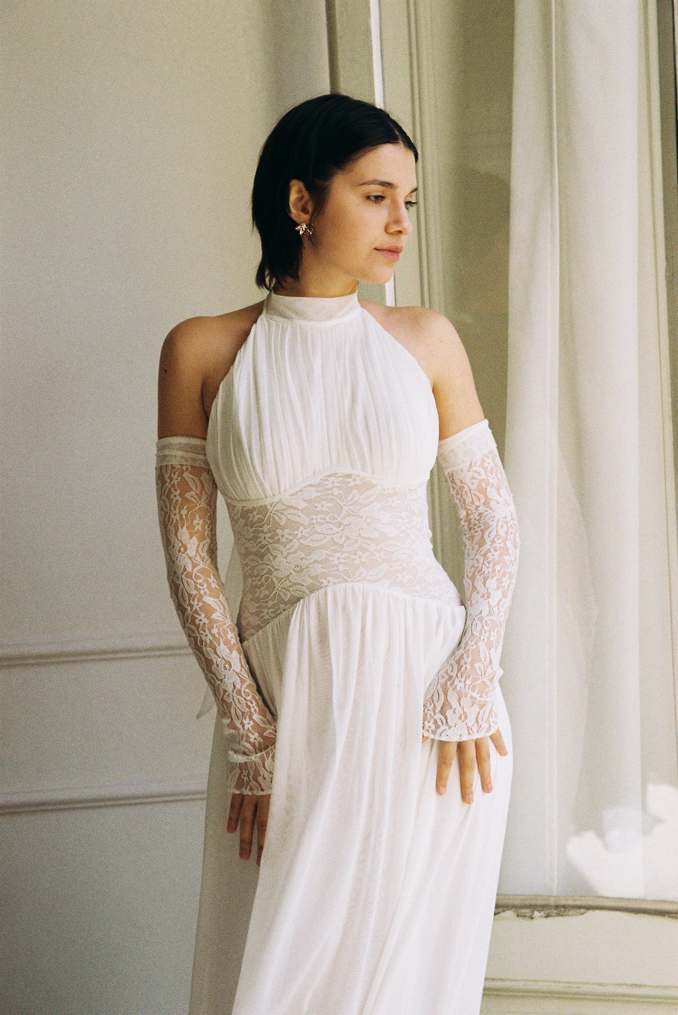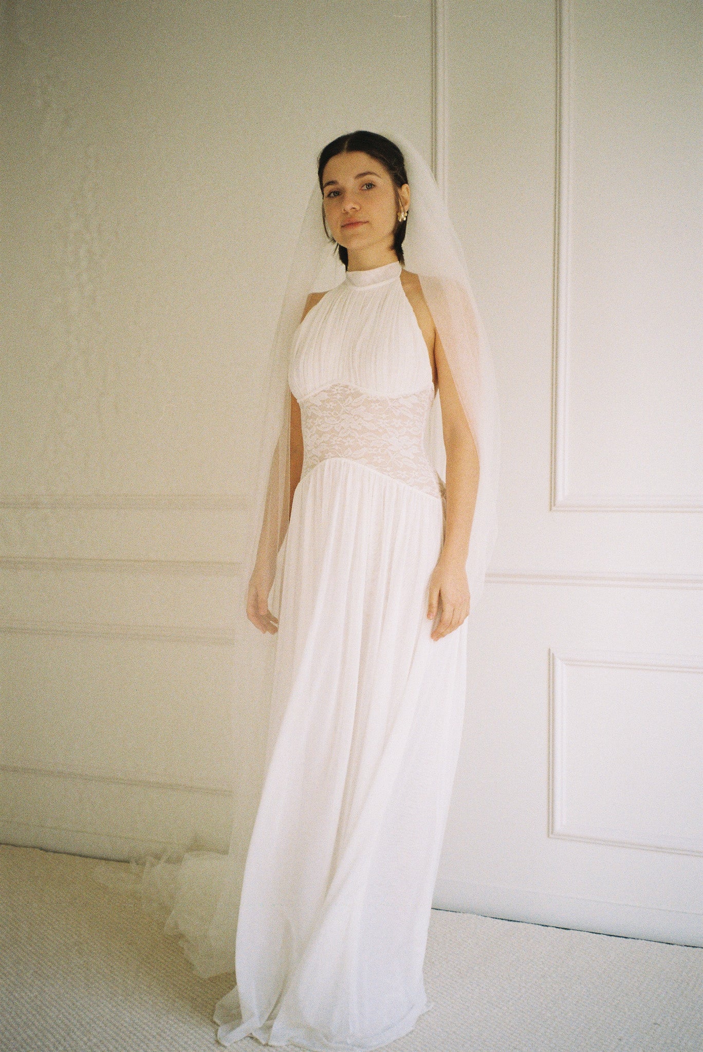 The Eloise Dress combines a gracefully draped halter neck with a semi-low back and intricate lace bodice for an effortlessly elegant look. Whether paired with lace gloves for a polished finish or styled as a wedding gown with a veil, this dress delivers timeless sophistication for your special day.