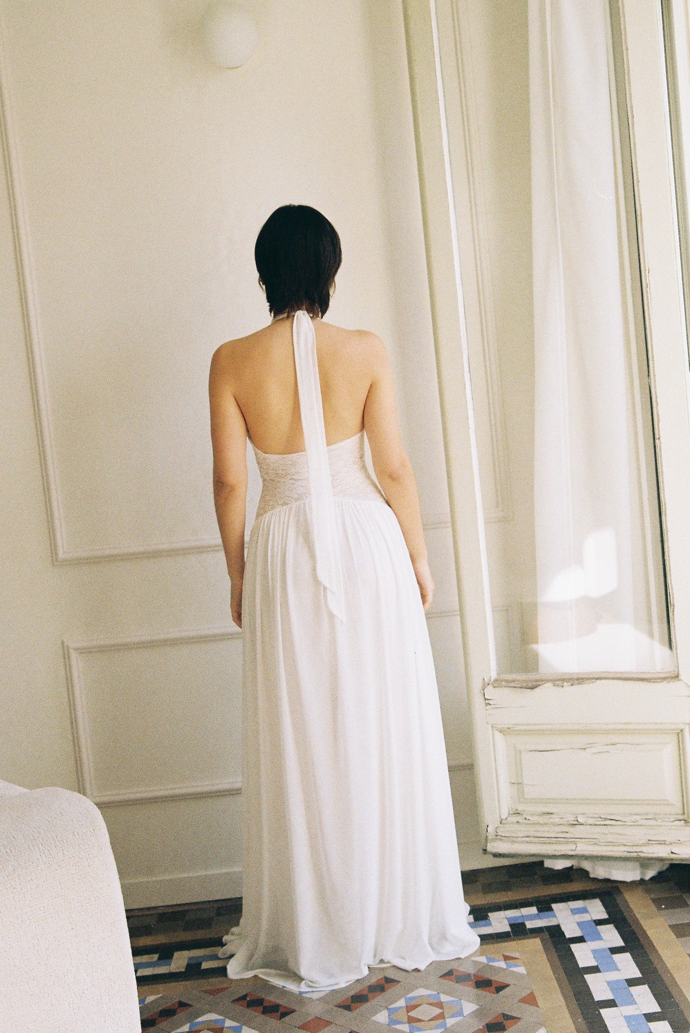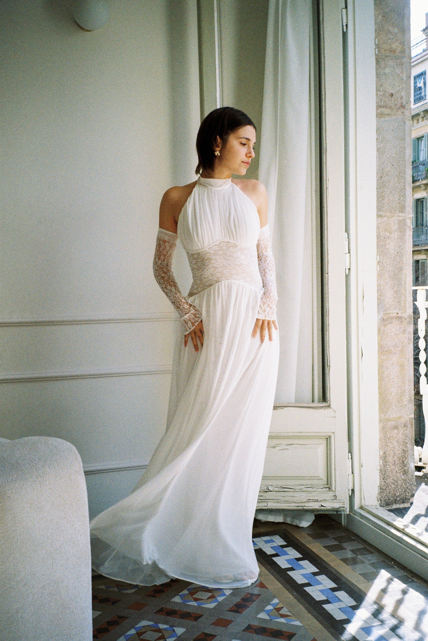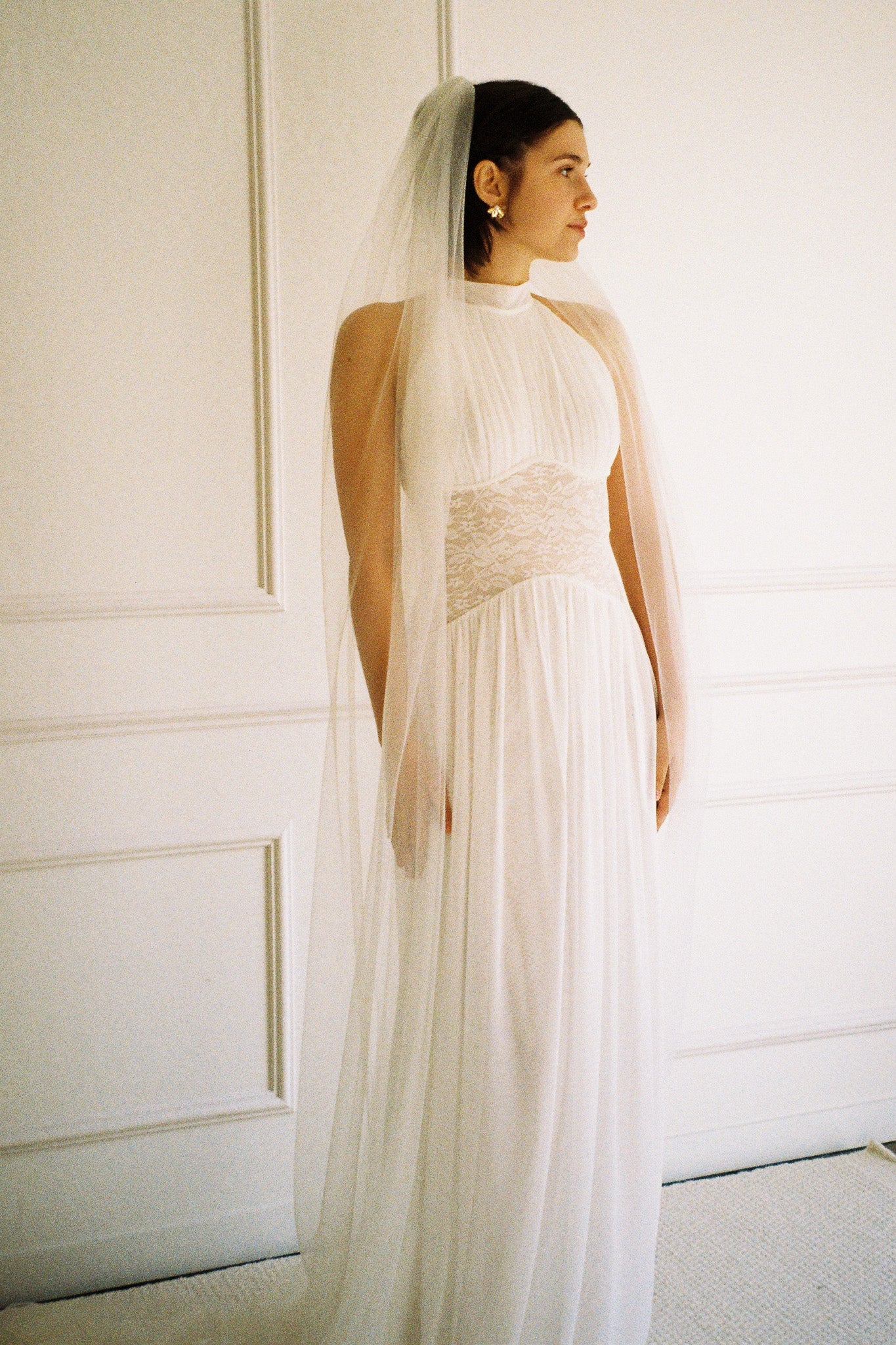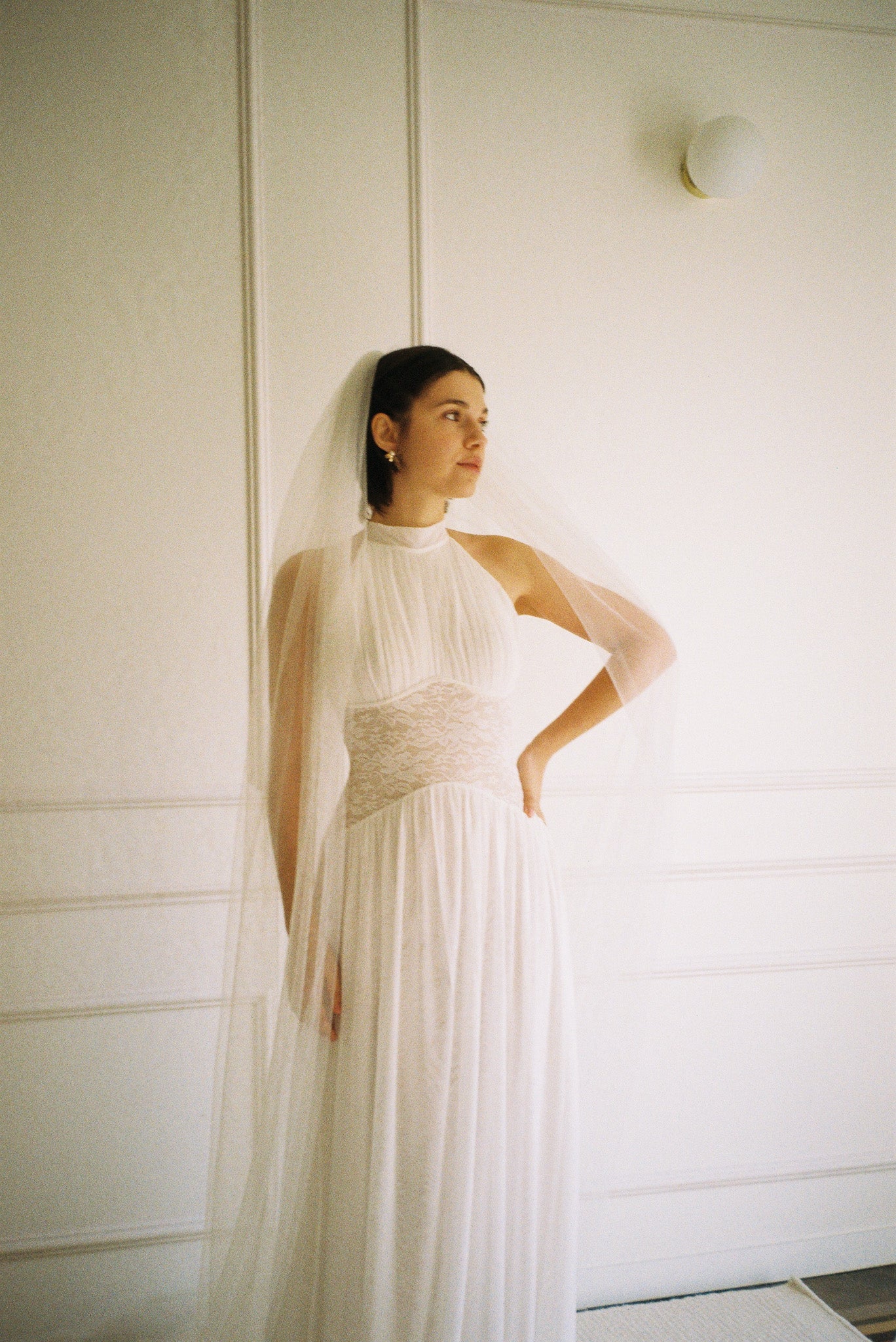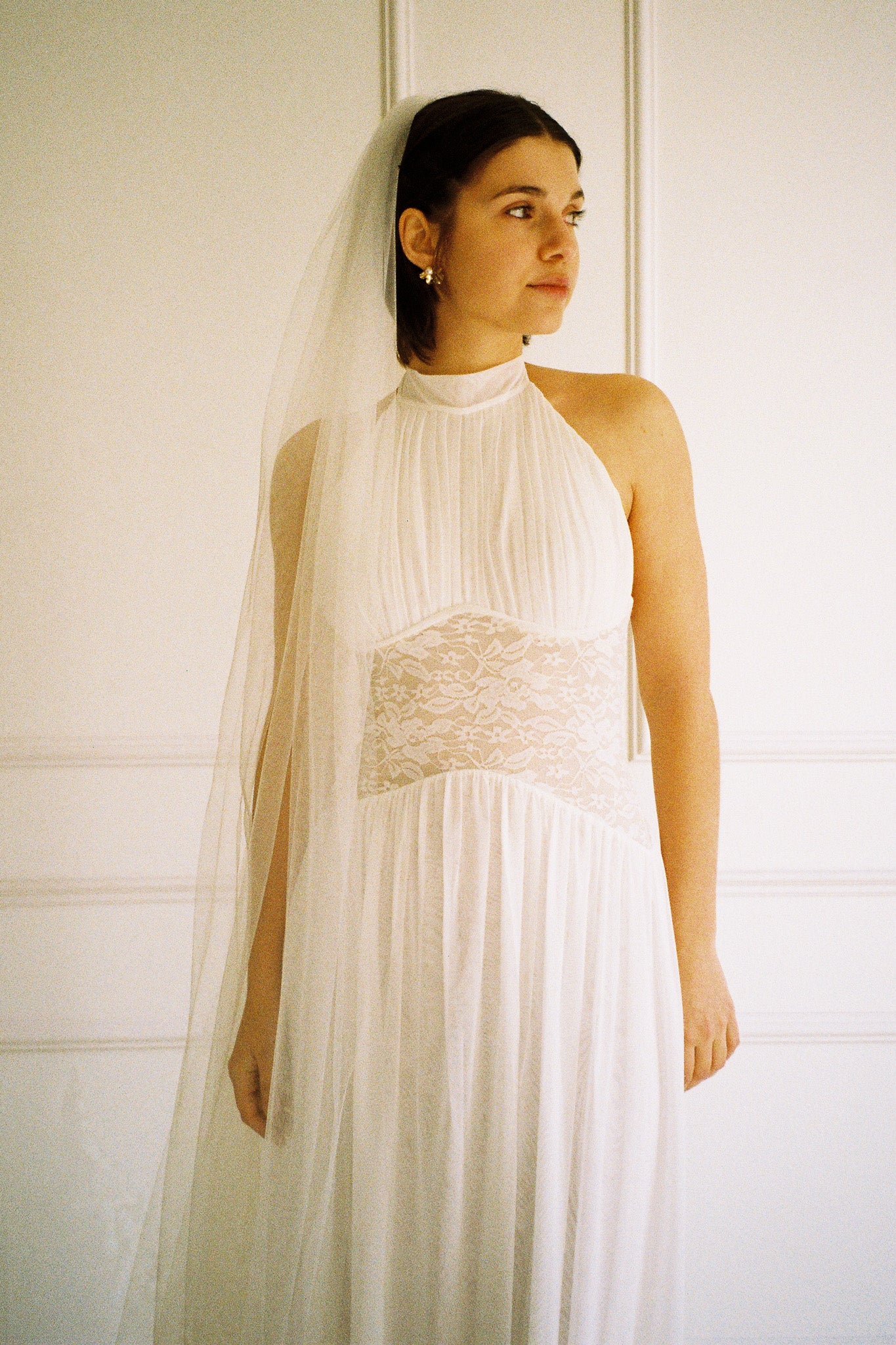 The Eloise Dress combines a gracefully draped halter neck with a semi-low back and intricate lace bodice for an effortlessly elegant look. Whether paired with lace gloves for a polished finish or styled as a wedding gown with a veil, this dress delivers timeless sophistication for your special day.
