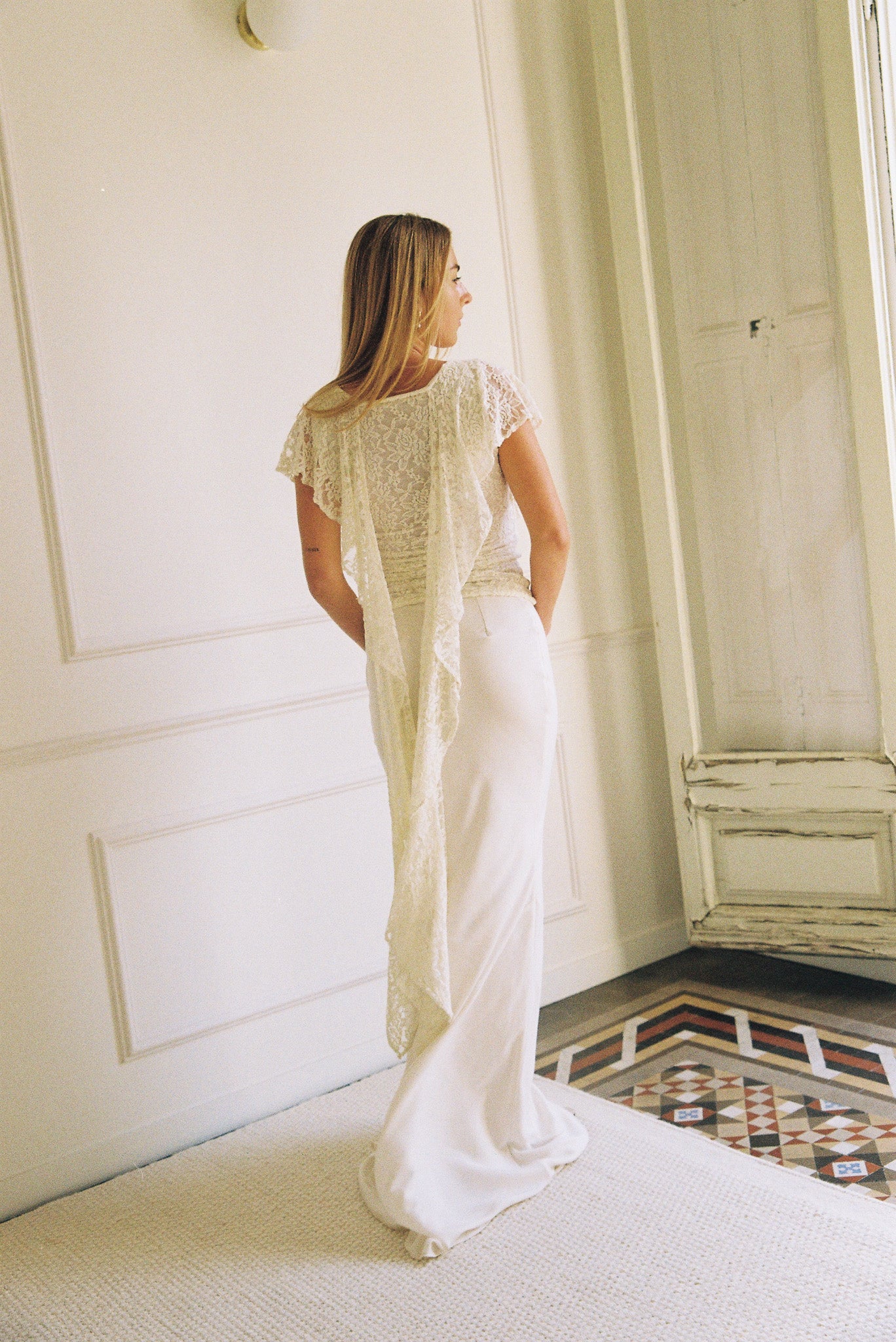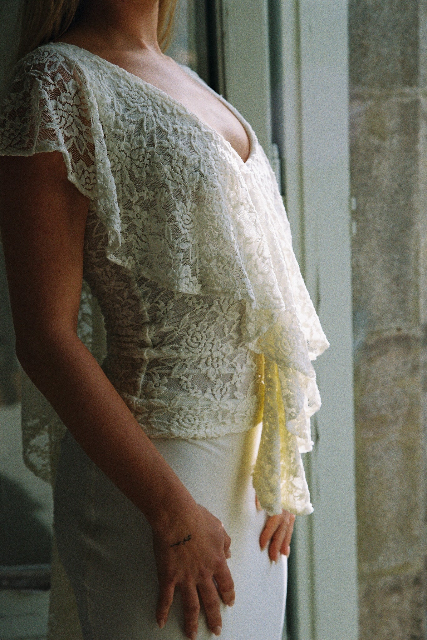 We've transformed your favorite dress into a top, now featuring delicate lace for a bridal moment. Paired perfectly with the ruffled bolero!
