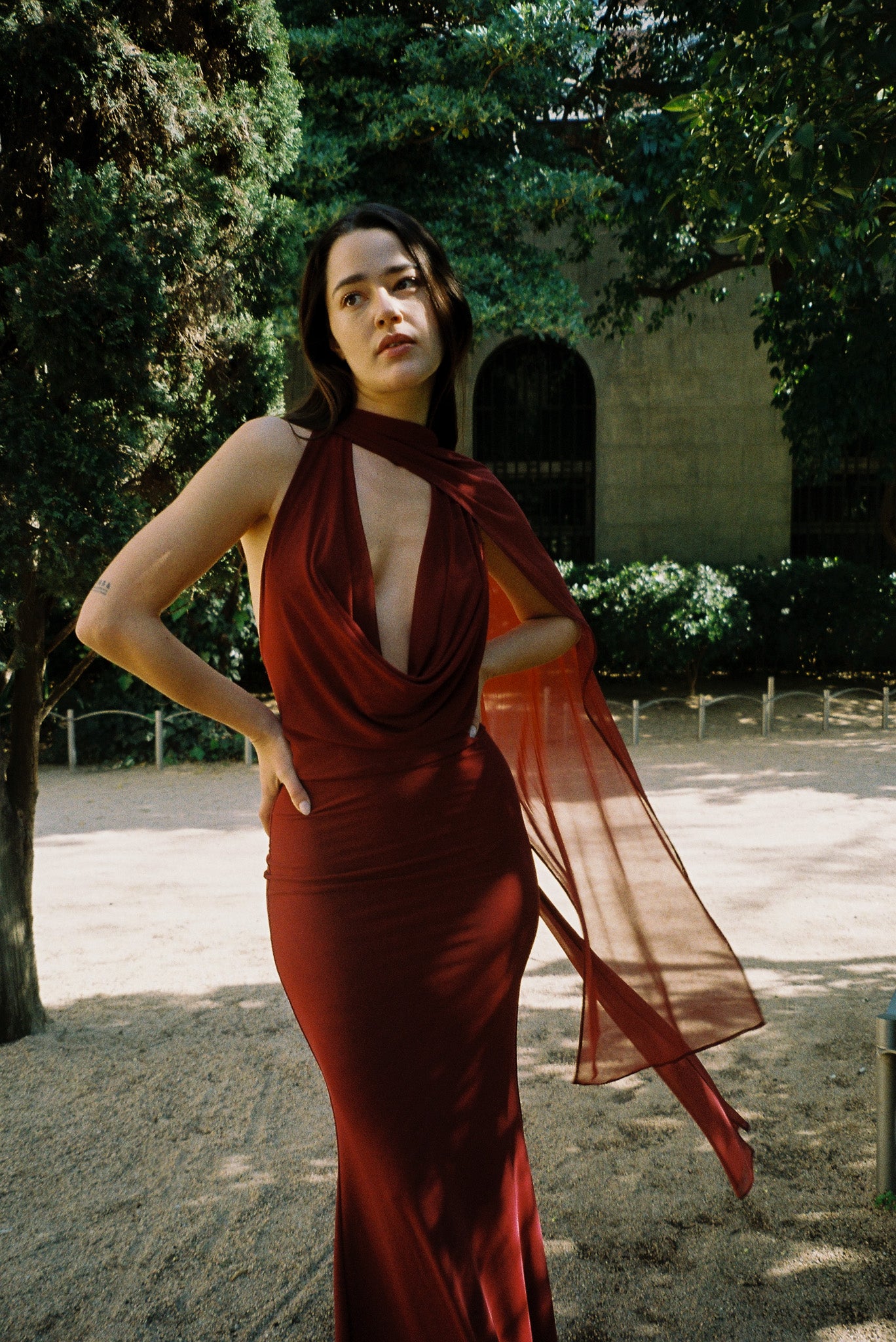 A simple yet beautiful maxi dress with a stunning cowl neck and a gorgeous low back.