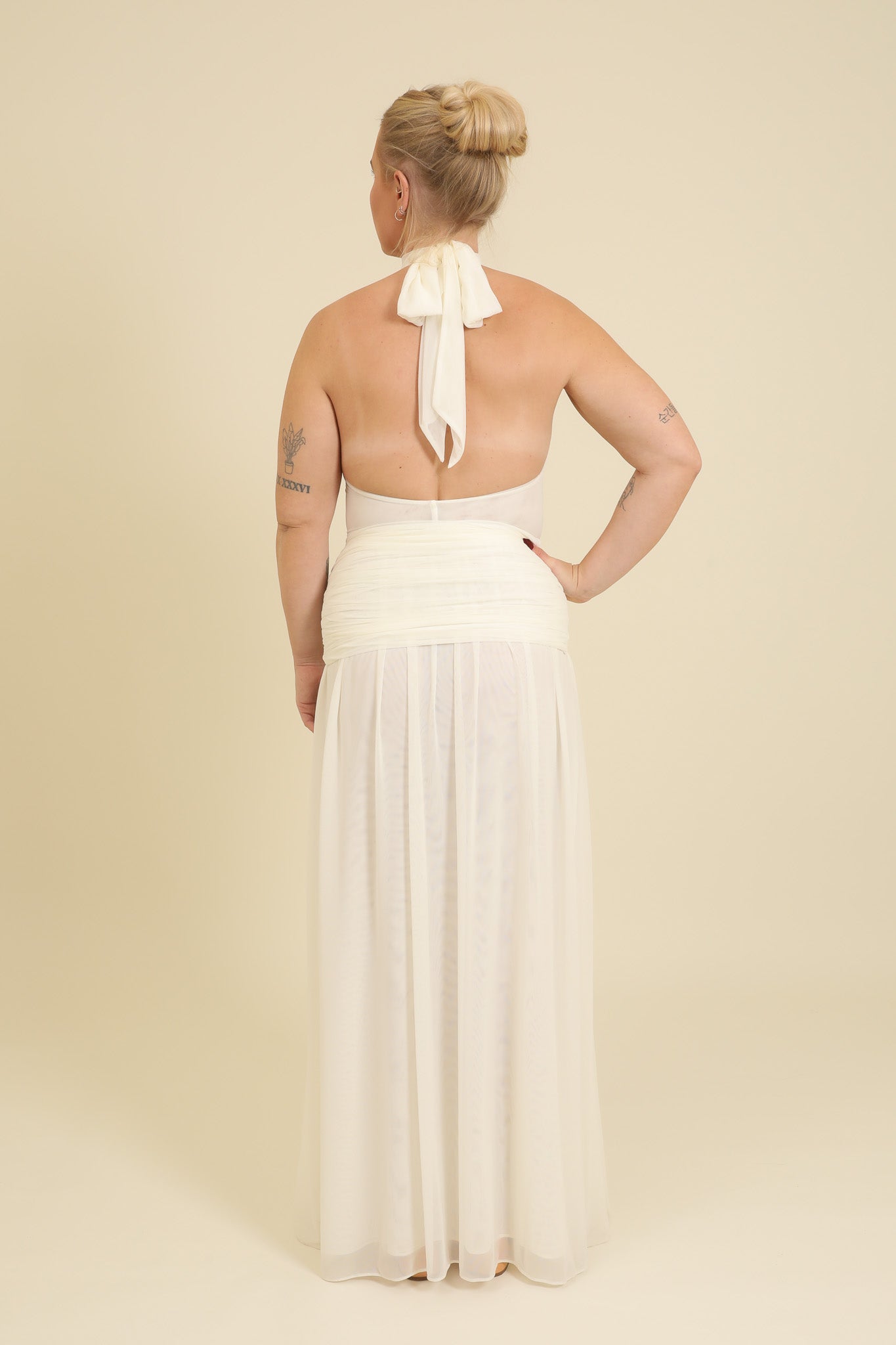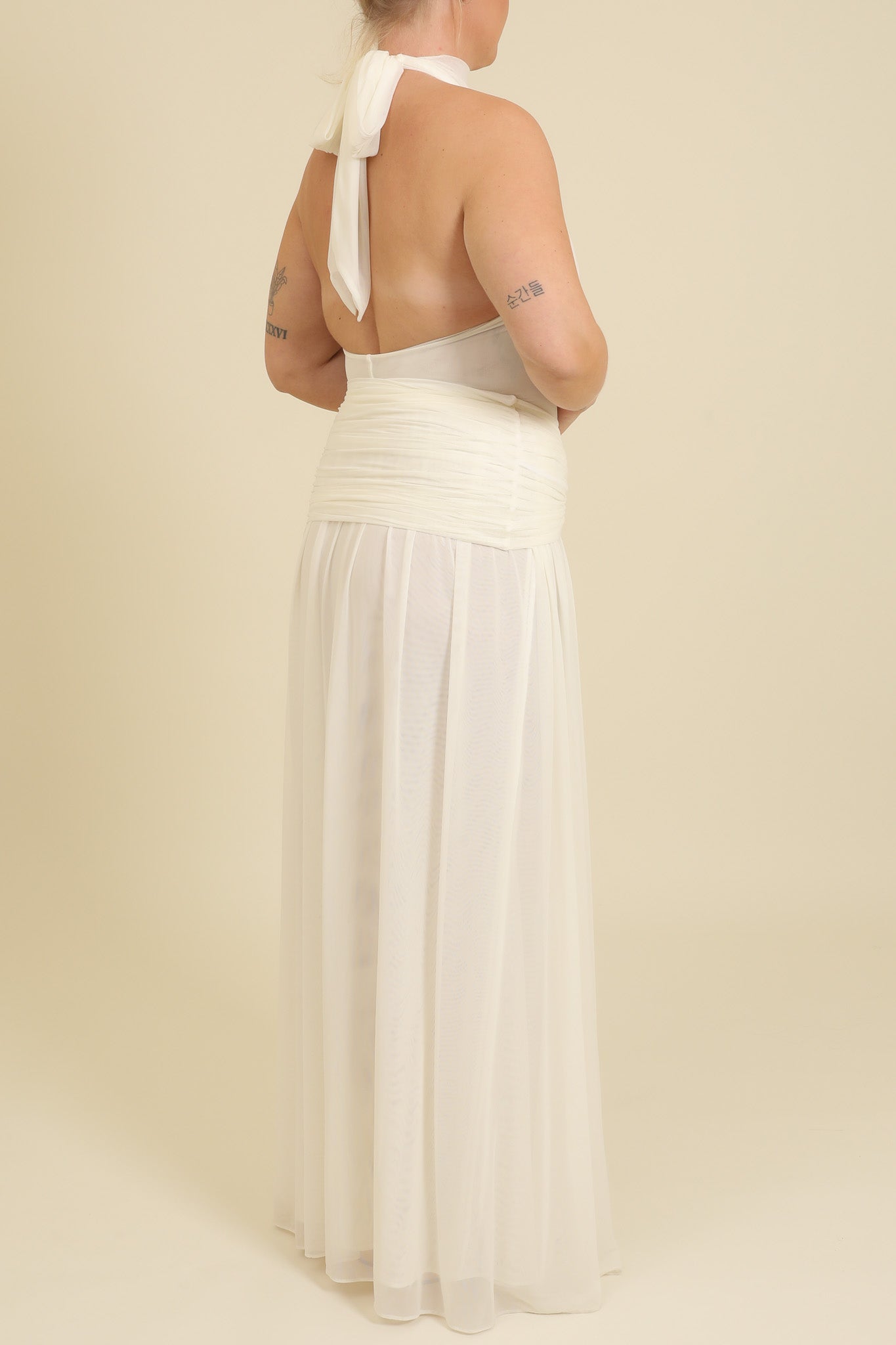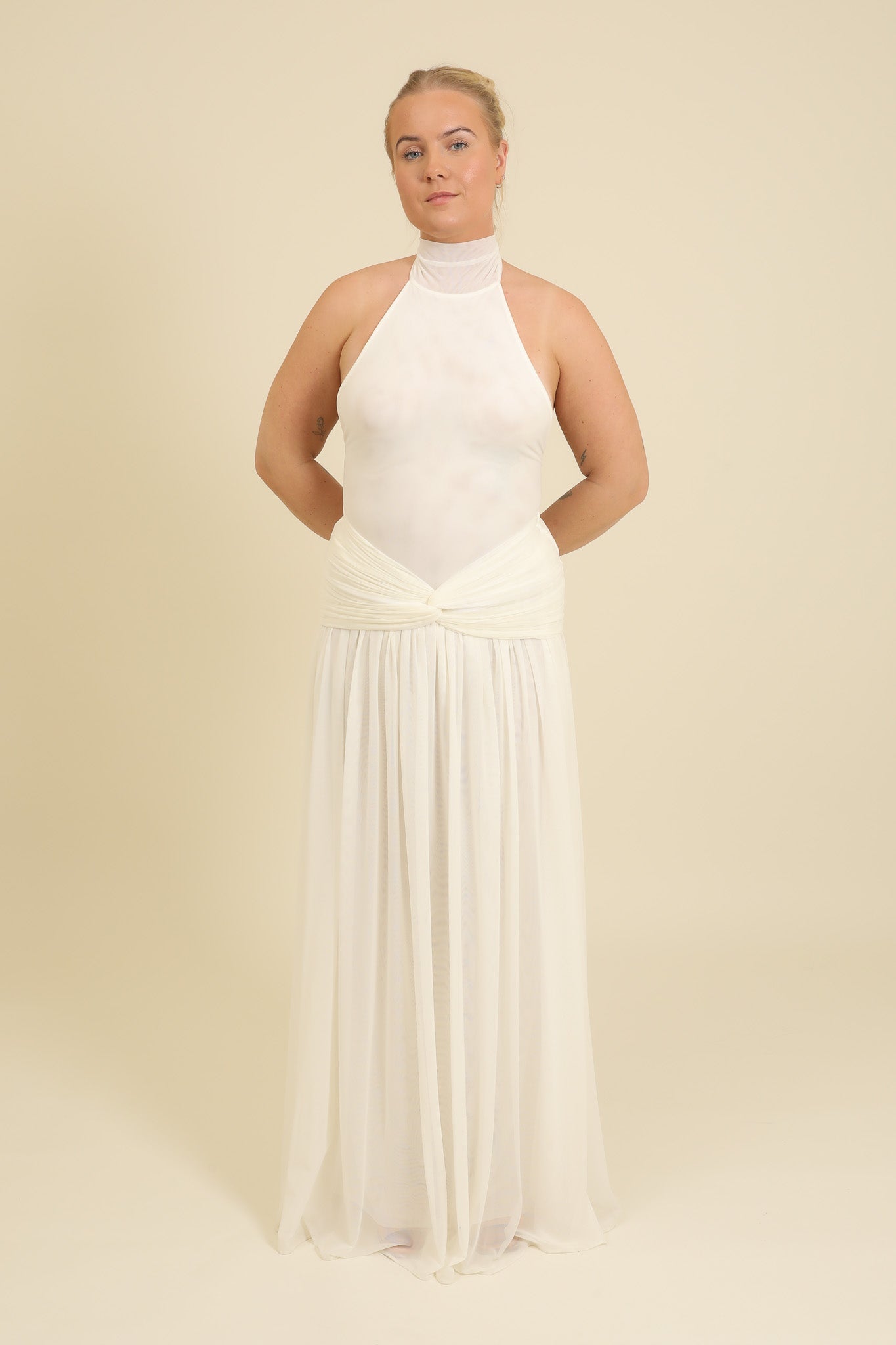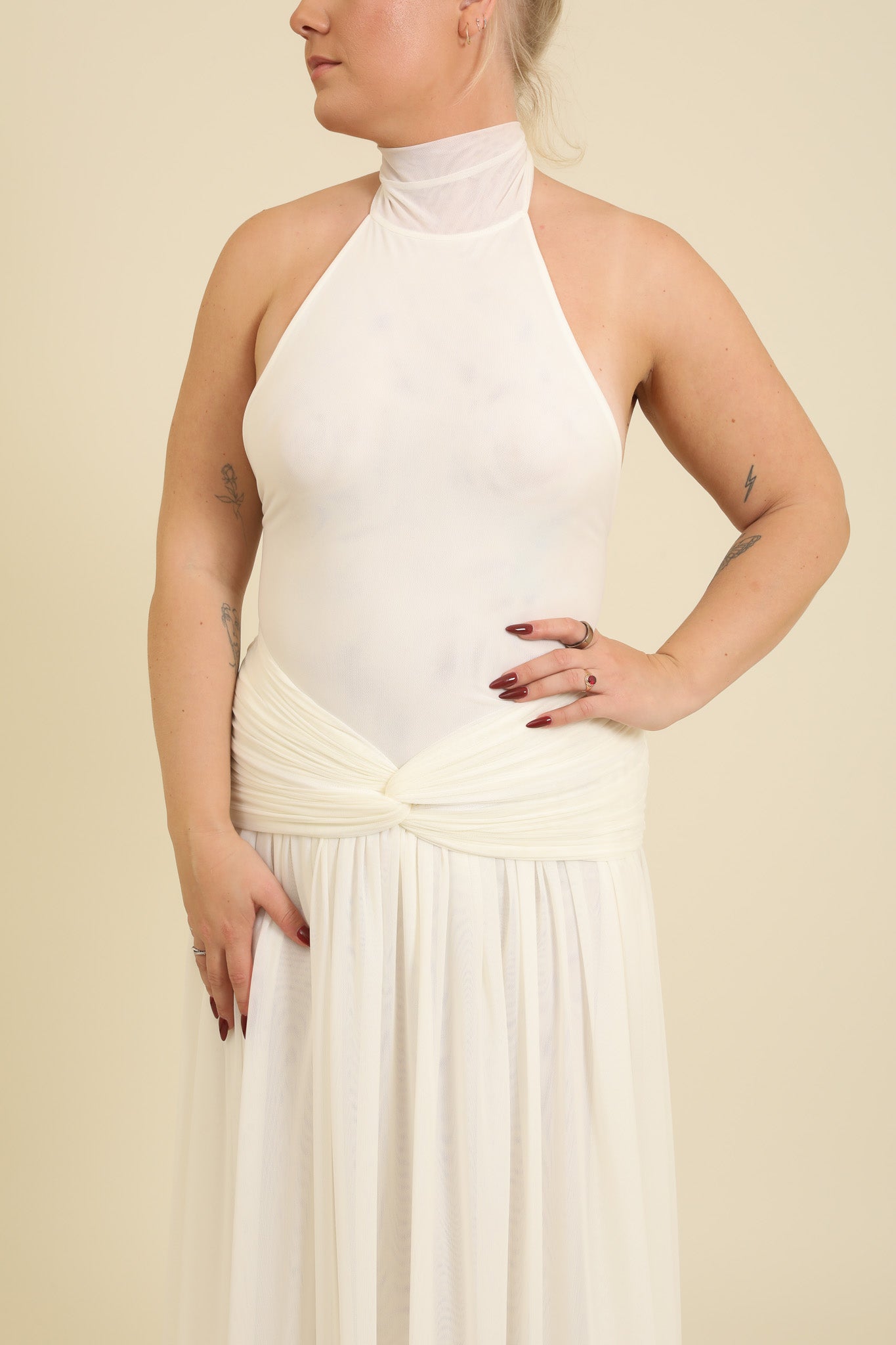 Elma is wearing a size Large in White, Halter neck.