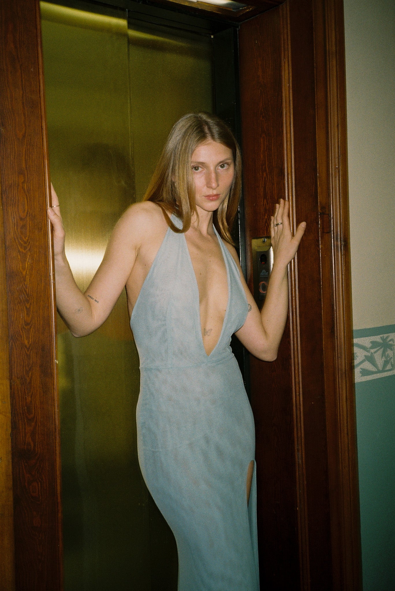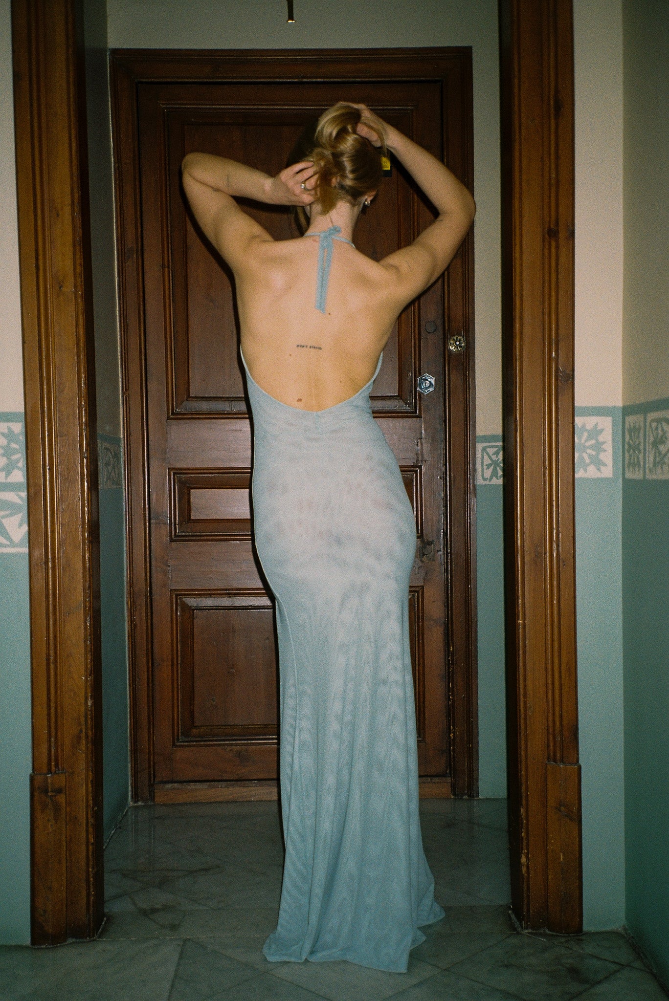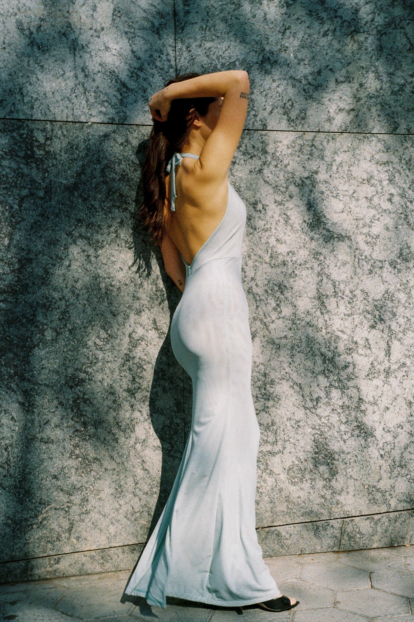 A low V-neck, simple yet elegant design. It features a striking low back that enhances the silhouette and creates a beautifully sculpted shape.