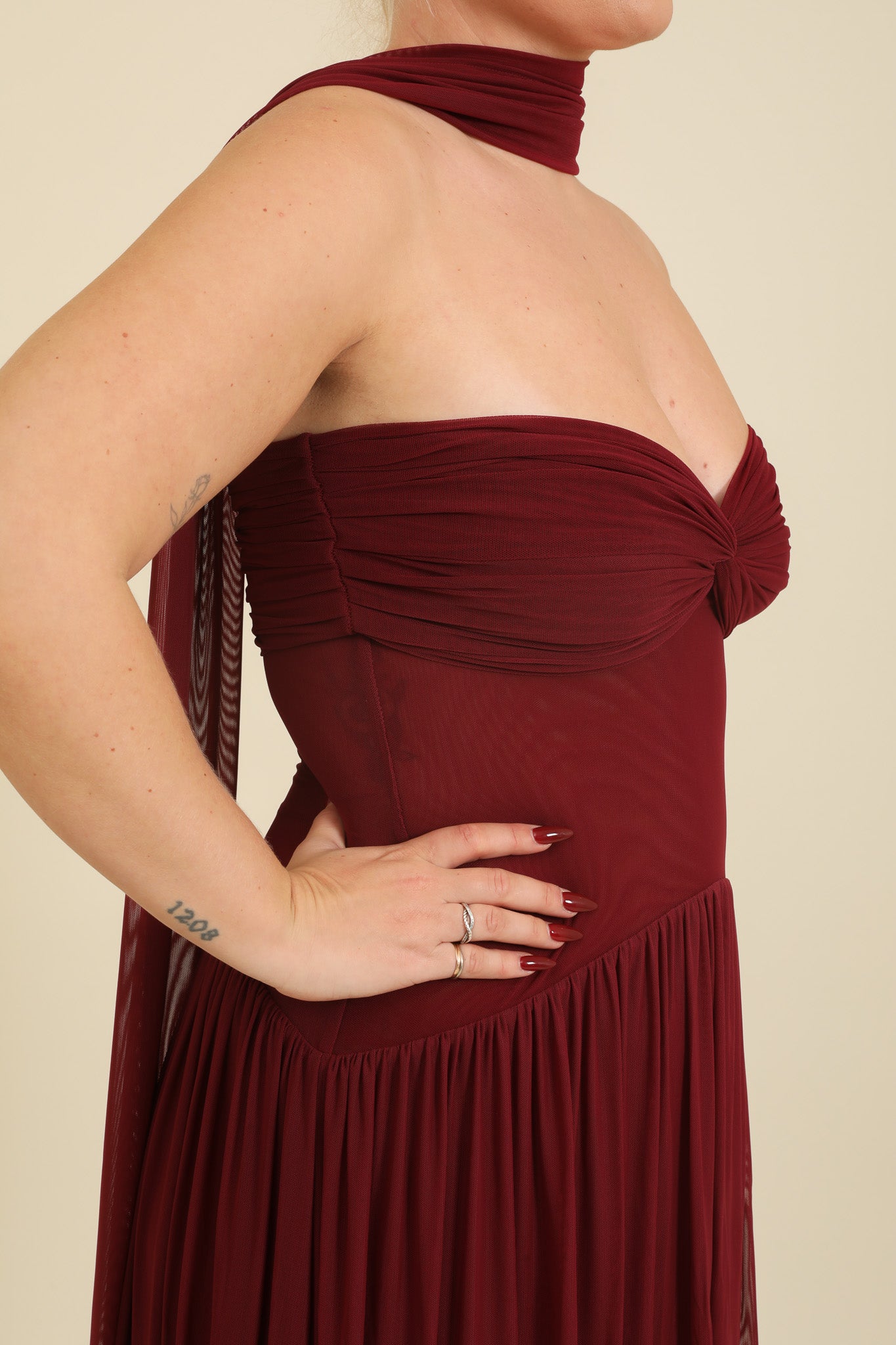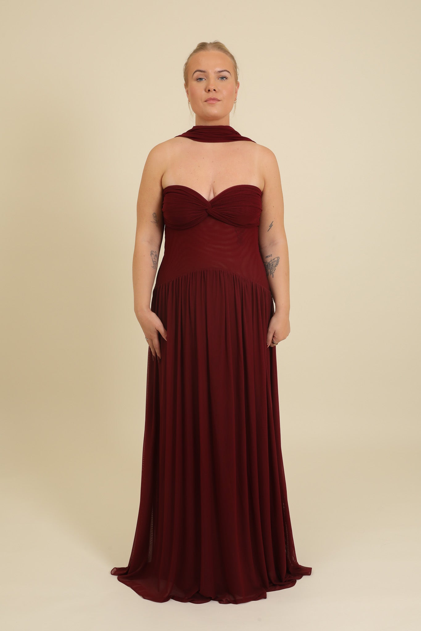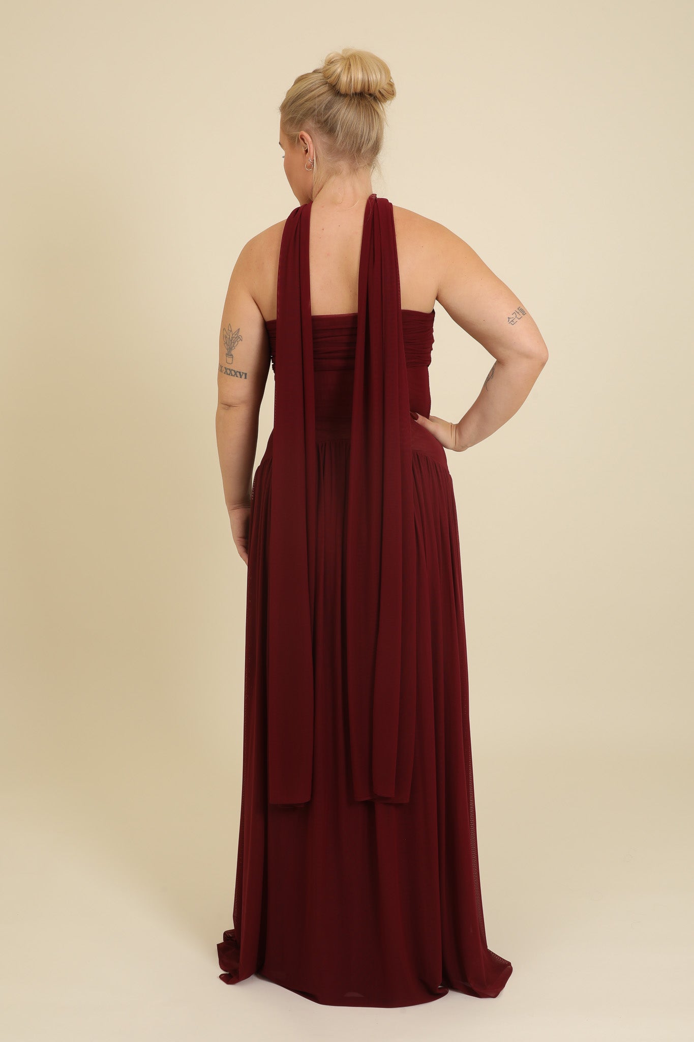 Elma is wearing a size Large in Burgundy.