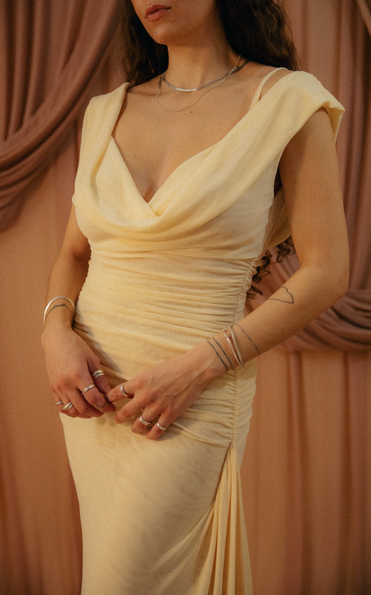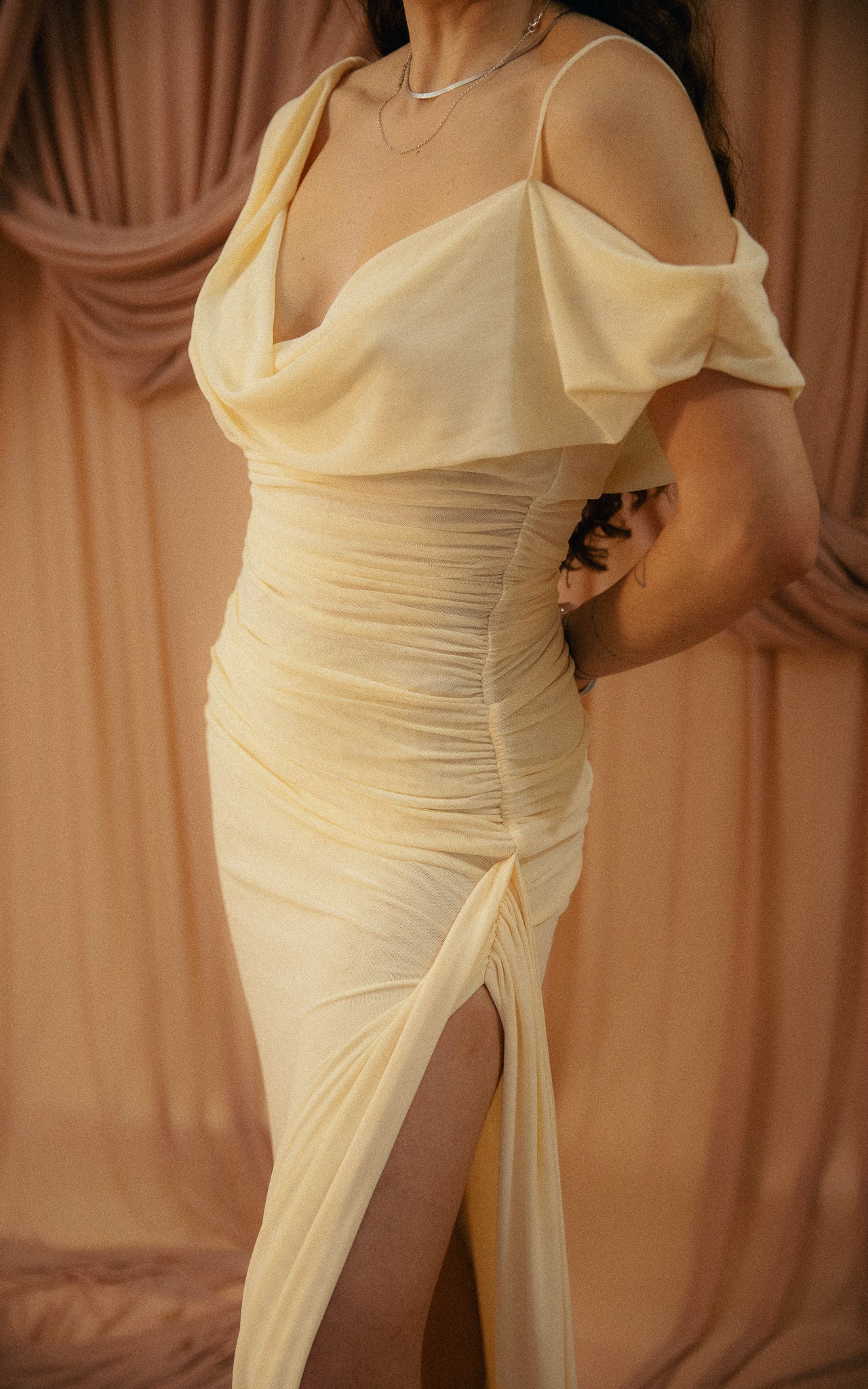 A beautiful, timeless dress with an elegant cowl neckline. Designed to be versatile, it can be worn as is, with one strap off the shoulder, or even both for a completely new look. Crafted from a delicate, lightweight fabric that drapes beautifully. The ruched detailing adds extra comfort while creating a flattering silhouette.