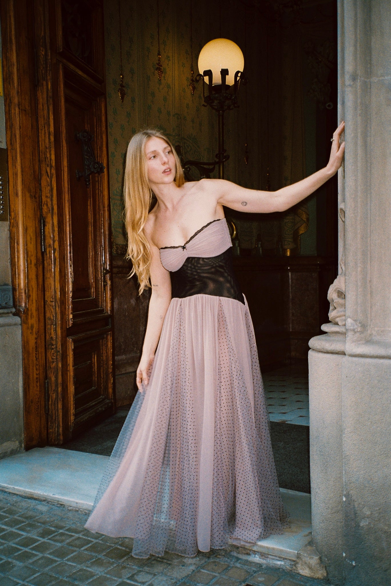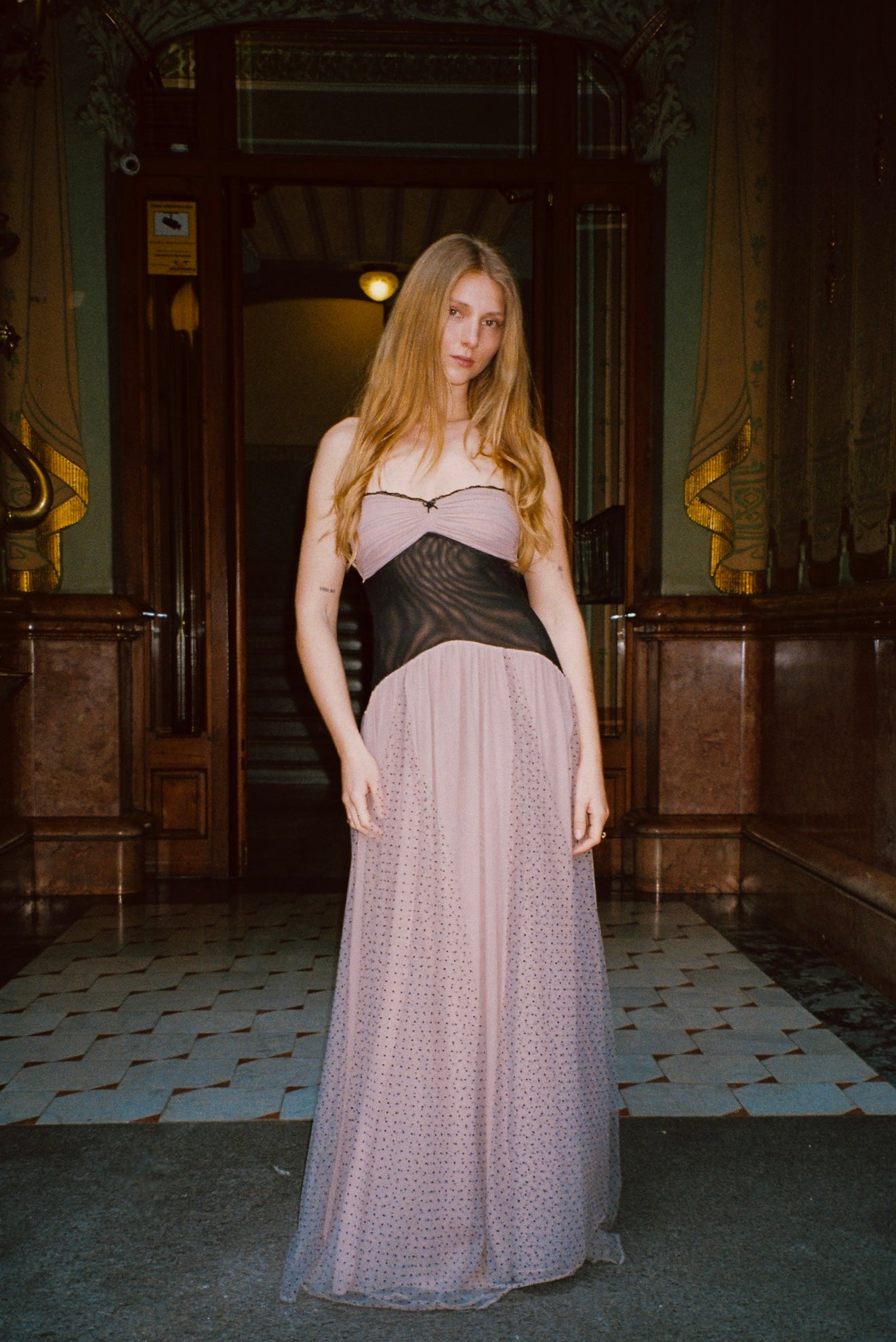 A beautiful, whimsical dress with a soft, romantic feel. Designed to gently shape the body while maintaining a sense of lightness and movement.