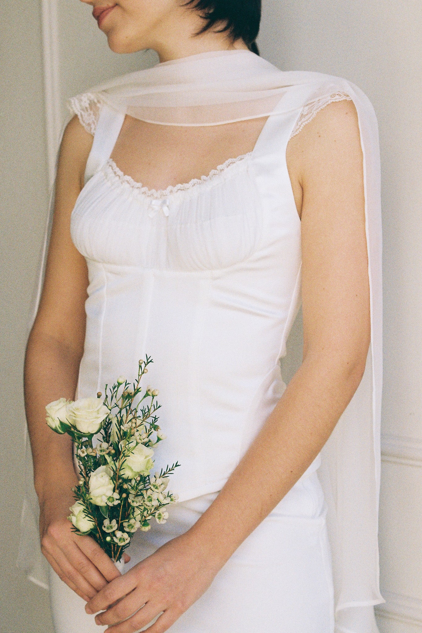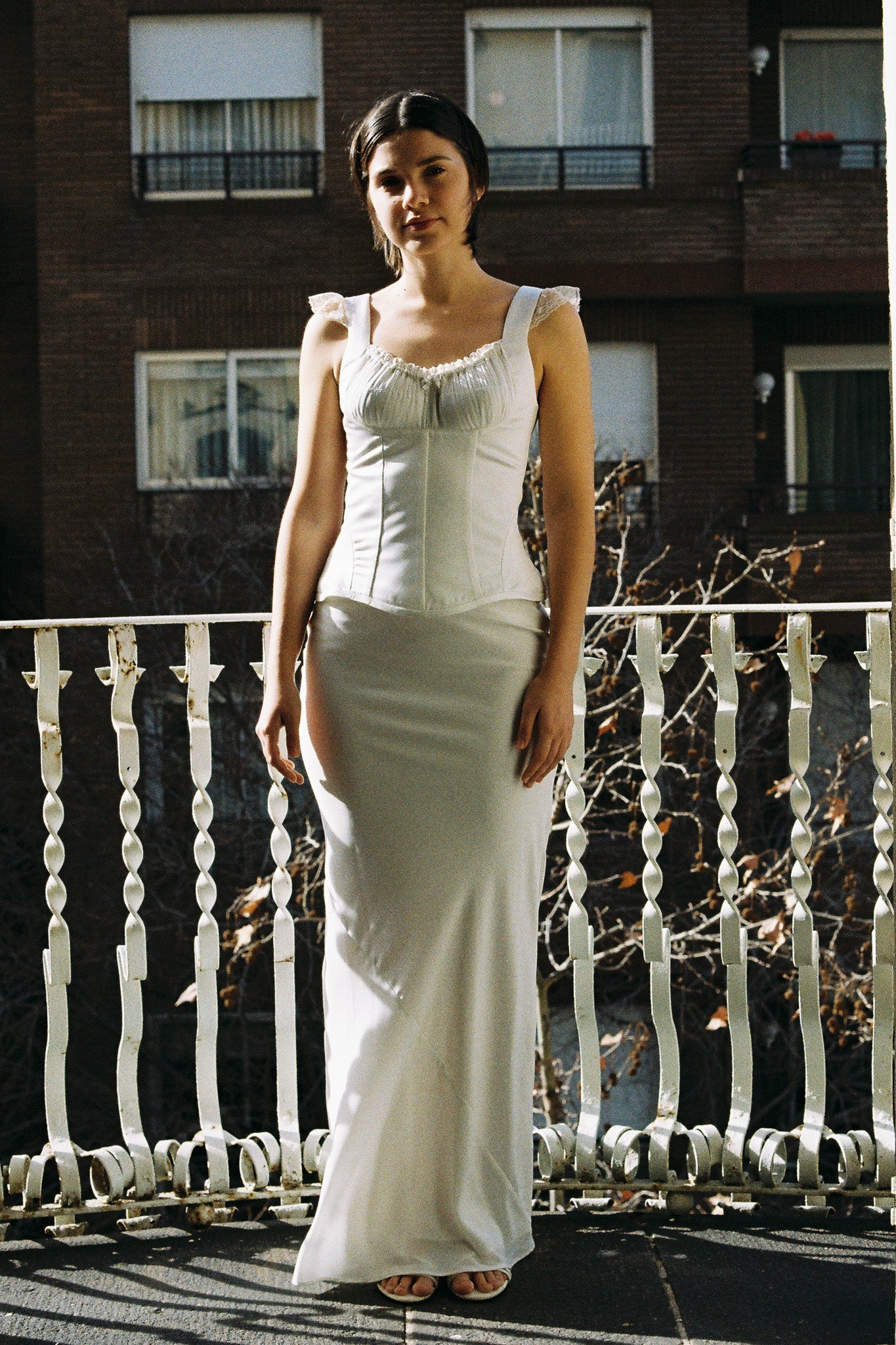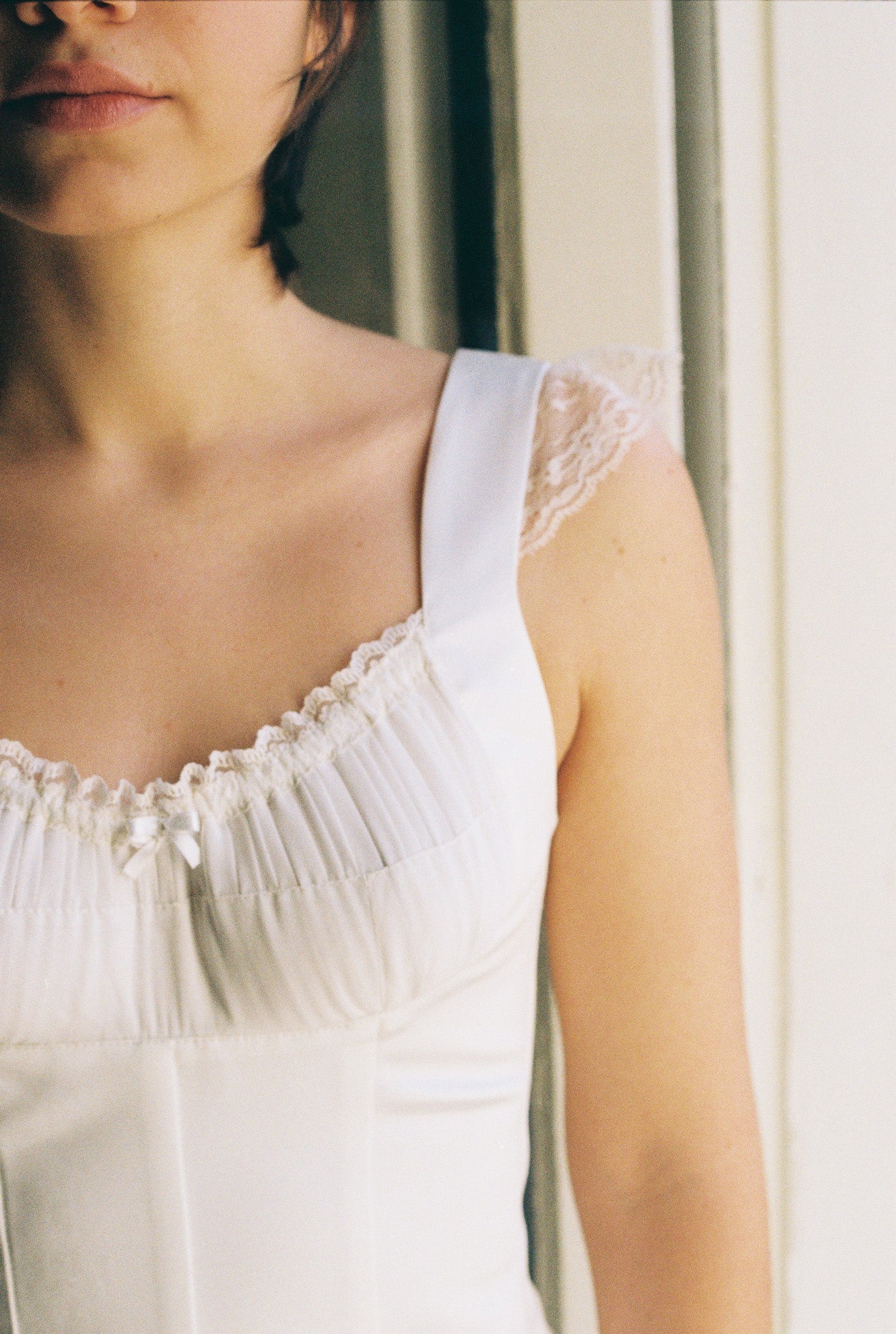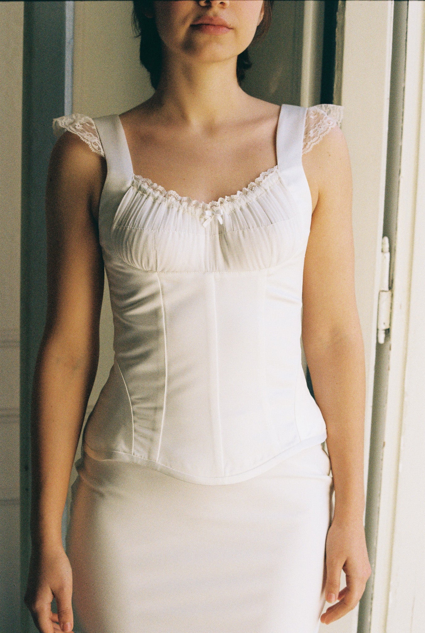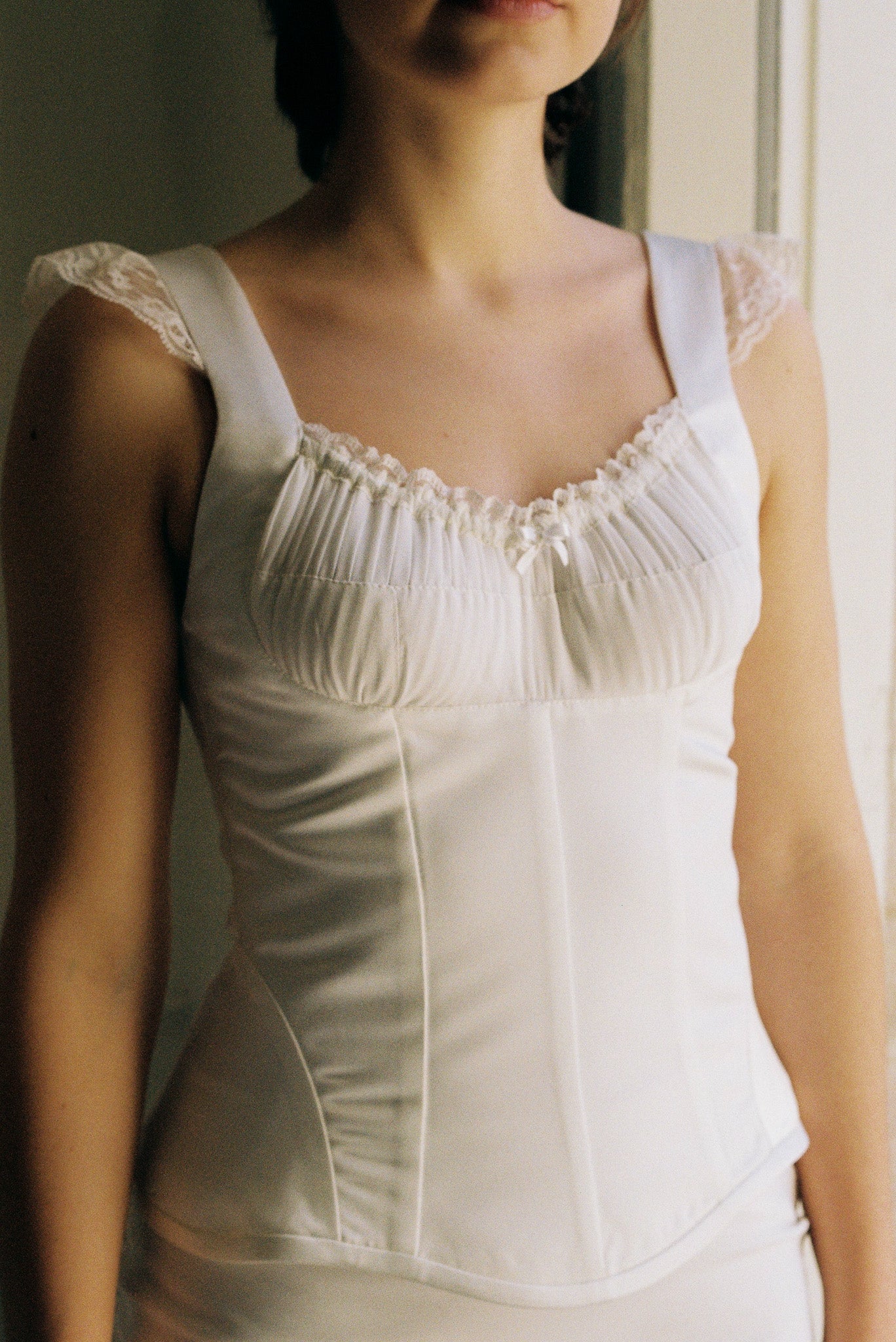 A bride's dream corset in luxurious silk, adorned with delicate lace at the bust and shoulders. This Victorian-inspired piece features a uniquely flattering silhouette that celebrates your figure. Every intricate detail whispers elegance and timeless romance.